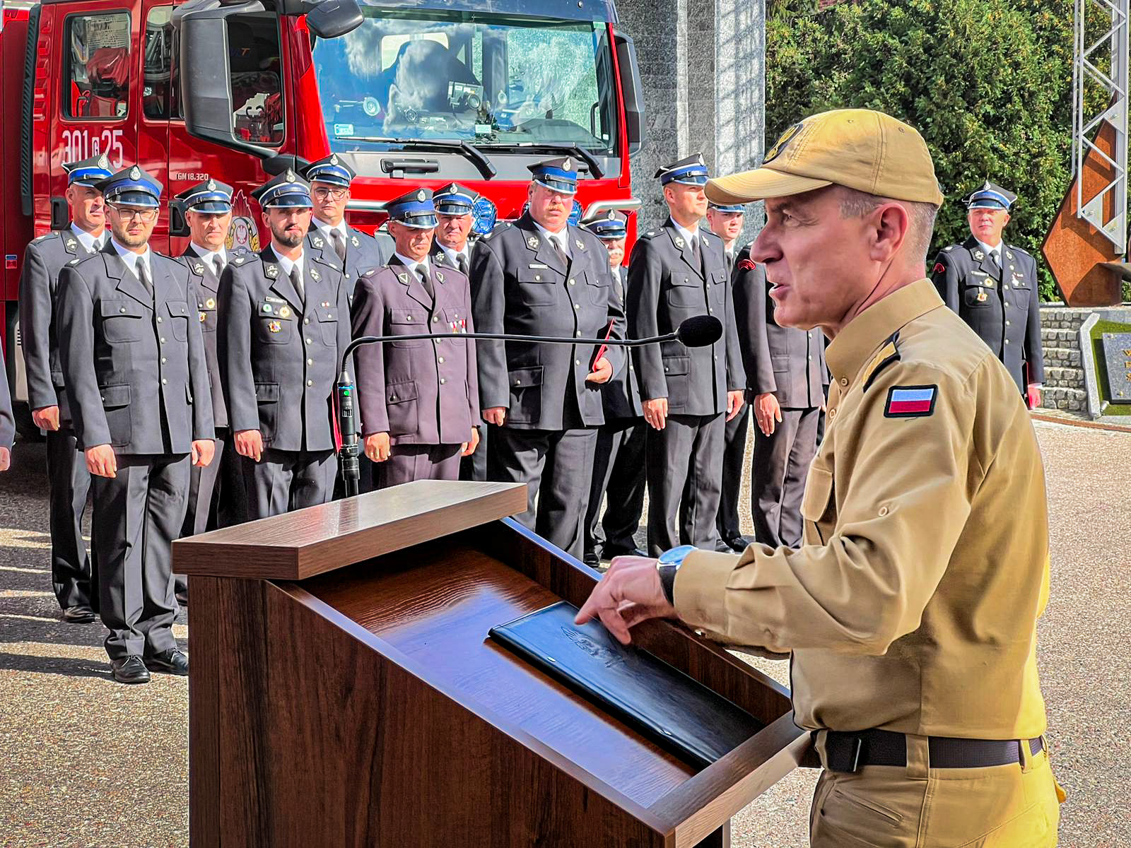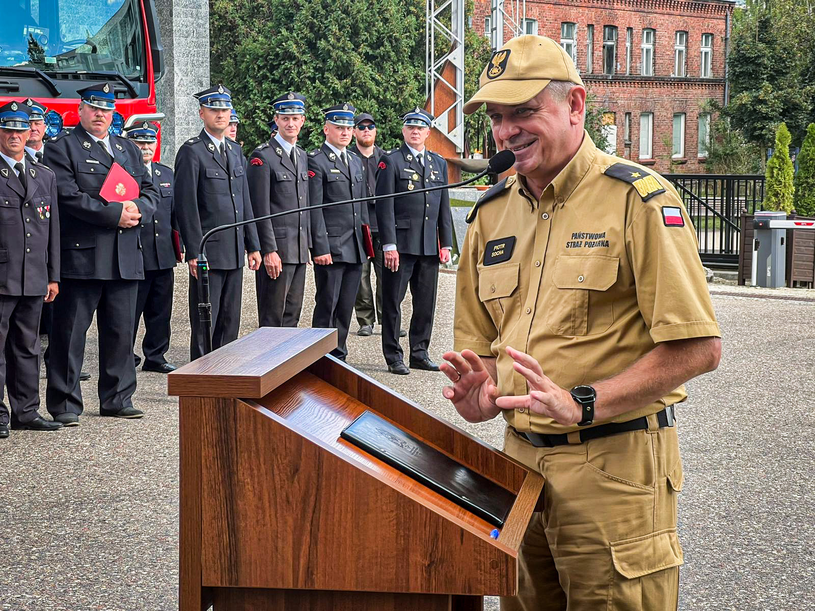„Przyjechałem też Wam podziękować za to, co robicie każdego dnia, jak wspaniale realizujecie swoje zadania. Przyjechałem z dobrą nowiną, która pokazuje że się rozwijamy cały czas jako Państwowa Straż Pożarna ale również Wy druhowie Ochotniczych Straży Pożarnych. To wszystko dzięki naszemu wspólnemu zaangażowaniu… nasz krajowy system ratowniczo – gaśniczy jest dziś wzorem dla innych na świecie, jestem dumny z tego, co udało się osiągnąć! Nasza współpraca na linii PSP – OSP też jest wzorem dla innych do naśladowania, jak można się dogadywać, w szczytnym celu ratowania ludzkiego życia i mienia! 31 tys. funkcjonariuszek, funkcjonariuszy i pracowników cywilnych w PSP, 240 tys. wyszkolonych druhen i druhów OSP i 400 tys. druhów stowarzyszonych w OSP, to blisko 700 tys. ludzi – nie ma takiej drugiej „armii” w Polsce! Niech św. Florian każdego dnia nas pilnuje!”.