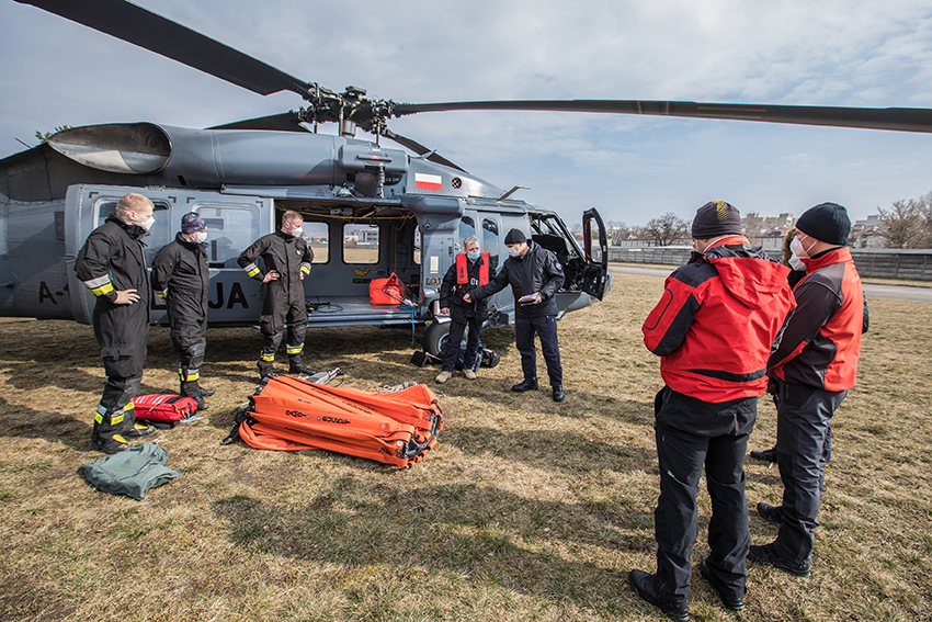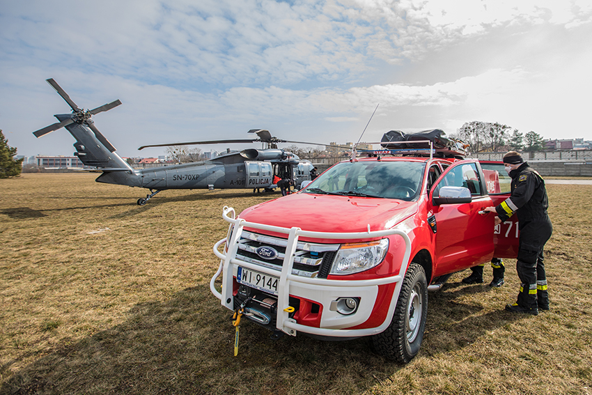 W dniach 16 – 17 marca br. na terenie Bazy Szkolenia Poligonowego i Innowacji Ratownictwa Szkoły Głównej Służby Pożarniczej w Nowym Dworze Mazowieckim odbyły się ćwiczenia wszystkich elementów w praktyce. „Podczas ćwiczeń sprawdzano zarówno poszczególne elementy systemu do autonomicznego zrzutu wody, system podwieszania zbiornika, jak i szybkość reagowania obu służb w przypadku zgłoszenia pożaru” poinformował koordynator ćwiczeń, zastępca dowódcy JRG nr 7 mł. bryg. inż. Grzegorz Kozioł.
