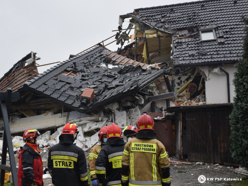 Po dojeździe pierwszych zastępów straży pożarnej zabezpieczono teren zdarzenia. Kierujący działaniami ratowniczymi po rozpoznaniu ustalił, że budynek jednorodzinny zawalił się częściowo, a w środku, pod gruzami najprawdopodobniej znajduję się jedna osoba. Ratownicy pomogli wydostać się pięciu osobom w tym dwójce dzieci, przebywającym w budynku w chwili wybuchu, poszkodowanych przekazano zespołom ratownictwa medycznego. Ratownicy sprawdzili także teren wokół gruzowiska, nikogo nie odnaleźli.