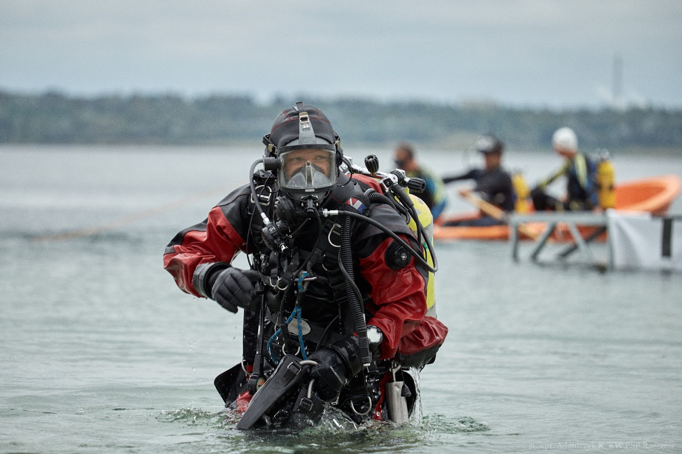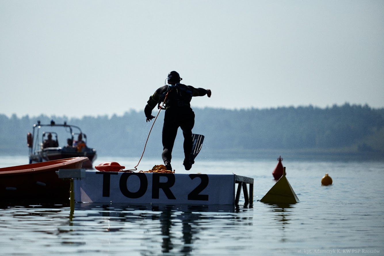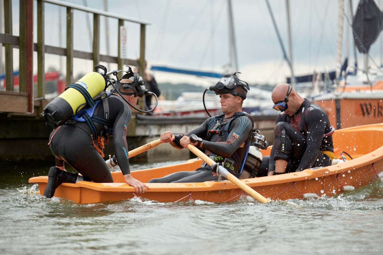 To było zadanie obejmujące wyciągnięcie poszkodowanego z głębokości 5 m, holowanie na odległość 20 m, podniesienie ciężkiego 30-kilogramowego obciążenia za pomocą zbiornika wypornościowego z dna akwenu, a następnie dopłynięcie do podwodnej bramki znajdującej się w odległości około 50 m.