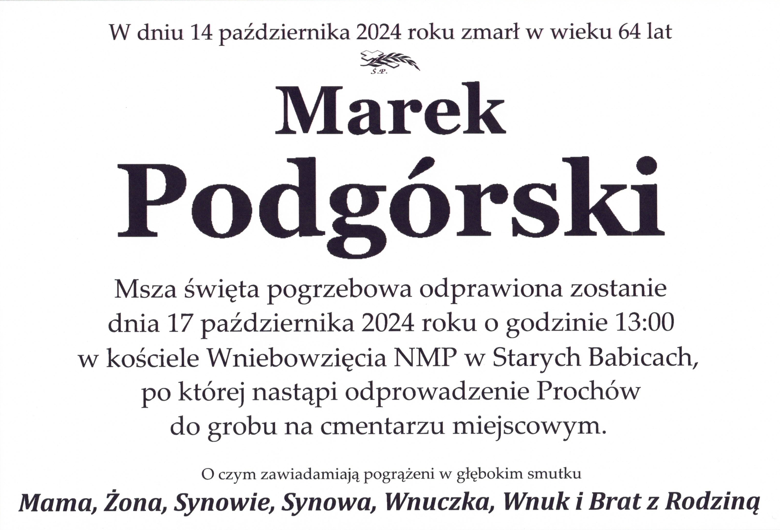 Z głębokim smutkiem przyjęliśmy informację, że w dniu 14 października 2024 r. zmarł st. bryg. w st. spocz. Marek Podgórski, były zastępca dyrektora oraz pełniący obowiązki dyrektora Biura Przeciwdziałania Zagrożeniom Komendy Głównej PSP w latach 1994-2007.