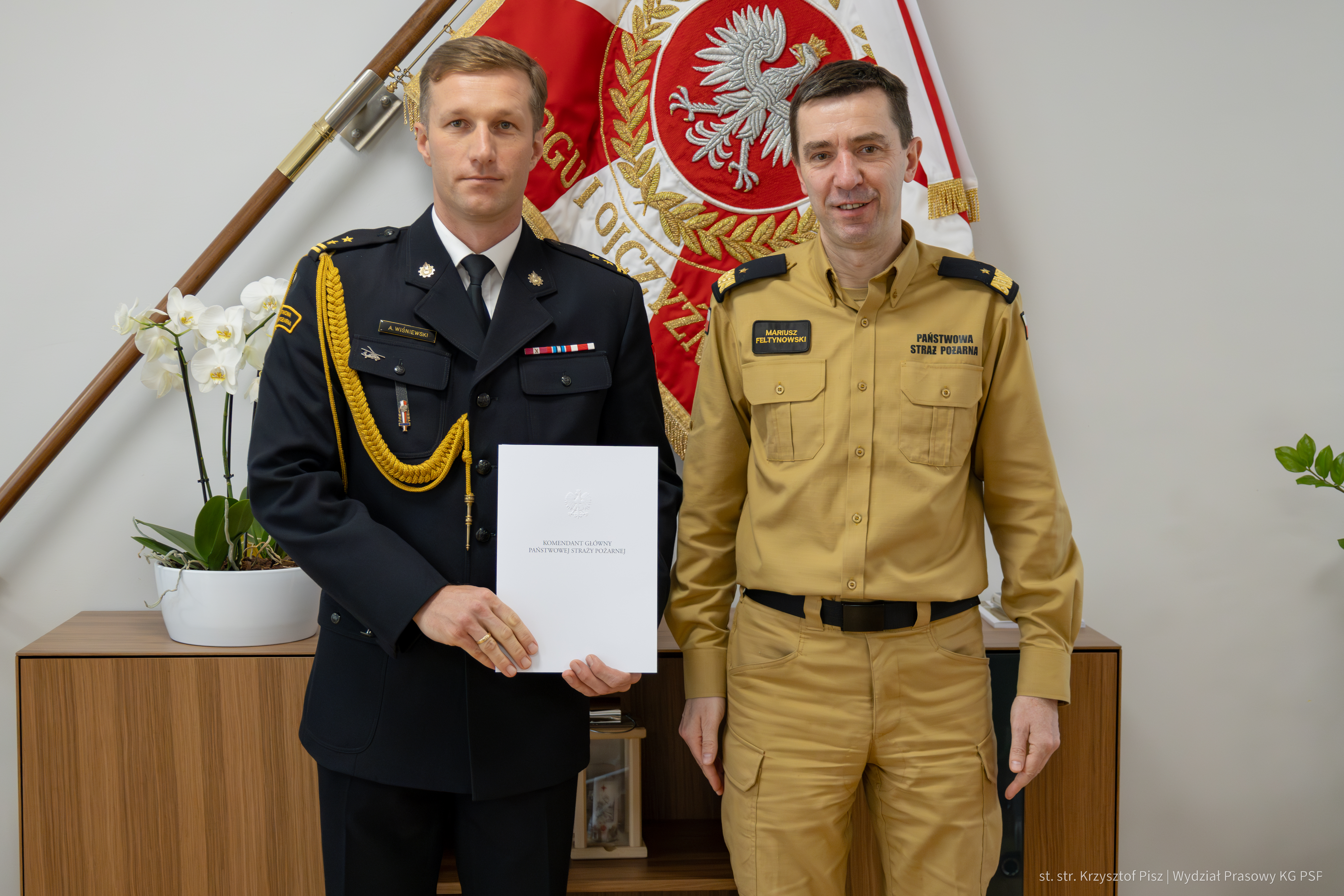 W poniedziałek 4 marca 2024 r. w siedzibie Komendy Głównej PSP, komendant główny PSP nadbryg. dr inż. Mariusz Feltynowski wręczył oficerom Państwowej Straży Pożarnej decyzje personalne, a otrzymali je: