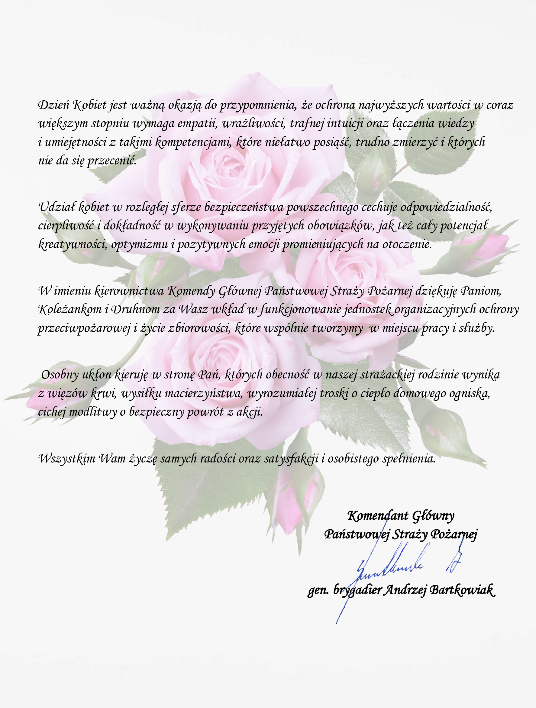 W imieniu kierownictwa Komendy Głównej Państwowej Straży Pożarnej dziękuję Paniom Koleżankom i Druhnom za Wasz wkład w funkcjonowanie jednostek organizacyjnych ochrony przeciwpożarowej i życie zbiorowości, które wspólnie tworzymy w miejscu pracy i służby.