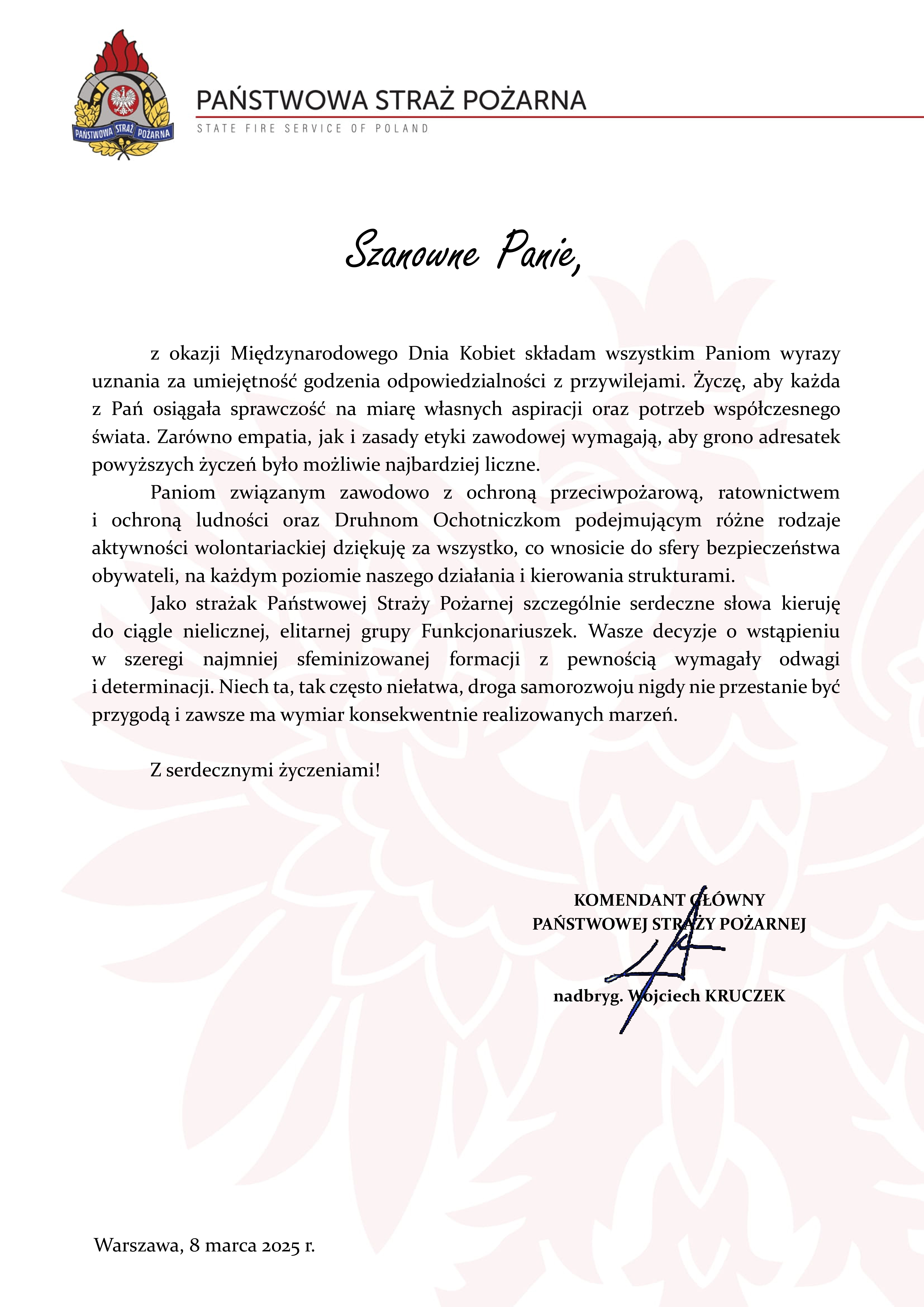 Życzenia Komendanta Głównego Państwowej Straży Pożarnej z okazji Międzynarodowego Dnia Kobiet