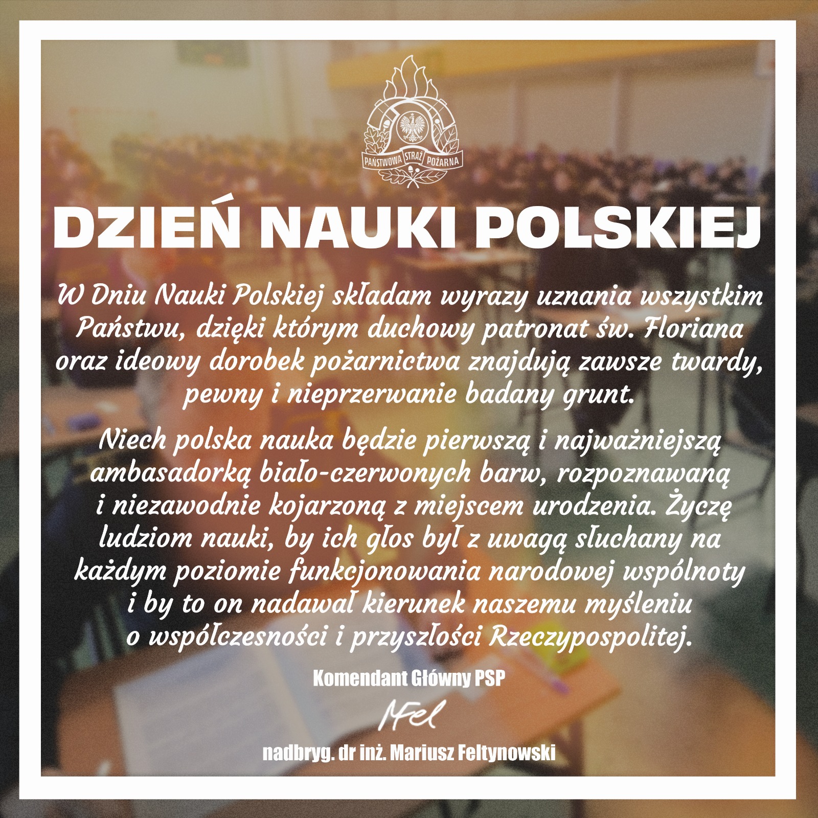 W Dniu Nauki Polskiej składam wyrazy uznania wszystkim Państwu, dzięki którym duchowy patronat św. Floriana oraz ideowy dorobek pożarnictwa znajdują zawsze twardy, pewny i nieprzerwanie badany grunt.