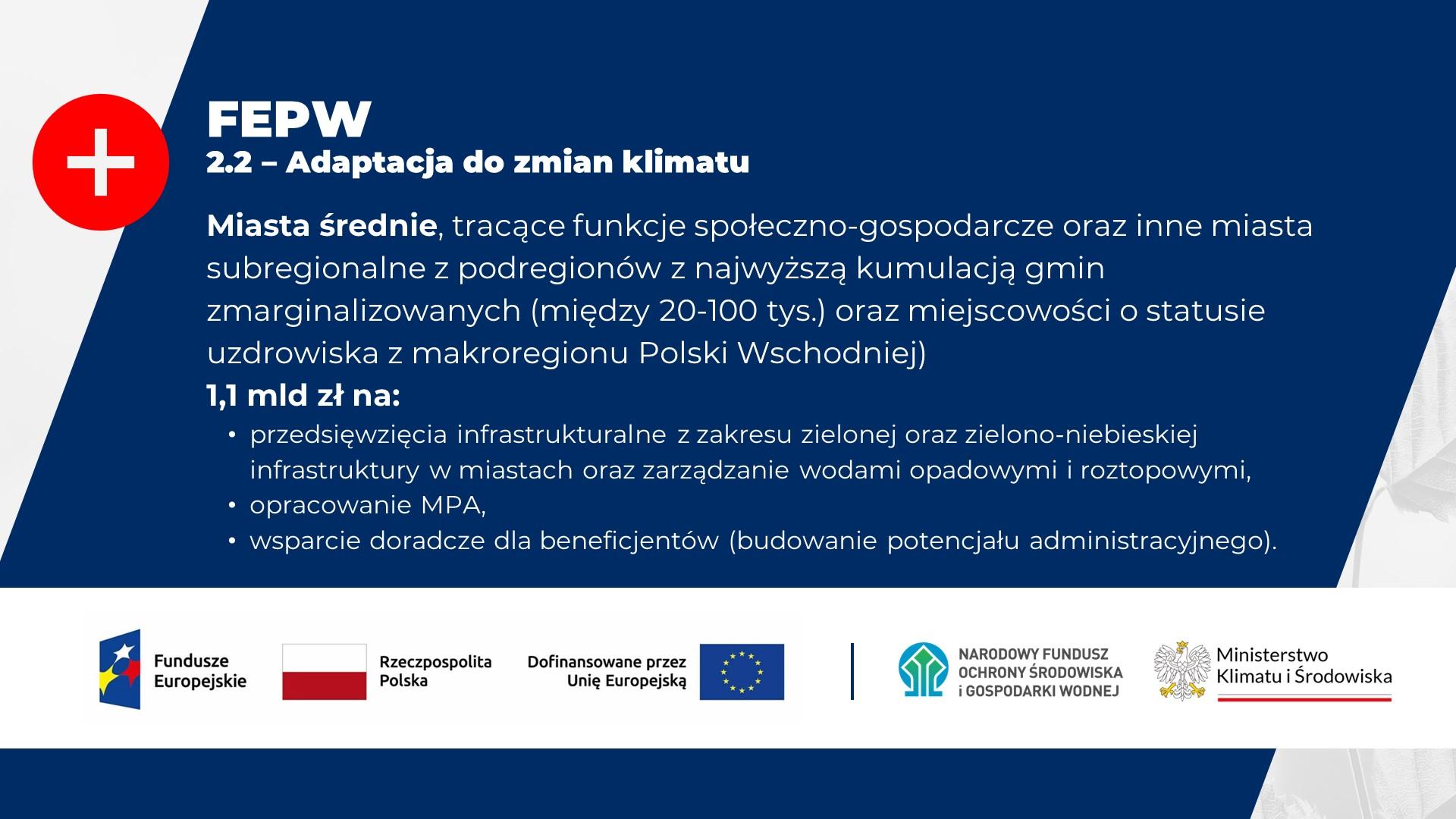 Oprócz wymienionego wcześniej wparcia w ramach Funduszy Europejskich dla Polski Wschodniej w działaniu 2.2: Adaptacja do zmian klimatu wesprzemy średnie miasta, tracące funkcje społeczno-gospodarcze oraz inne miasta subregionalne z podregionów z najwyższą kumulacją gmin zmarginalizowanych (między 20-100 tys.) i miejscowości o statusie uzdrowiska w tworzeniu m.in.: