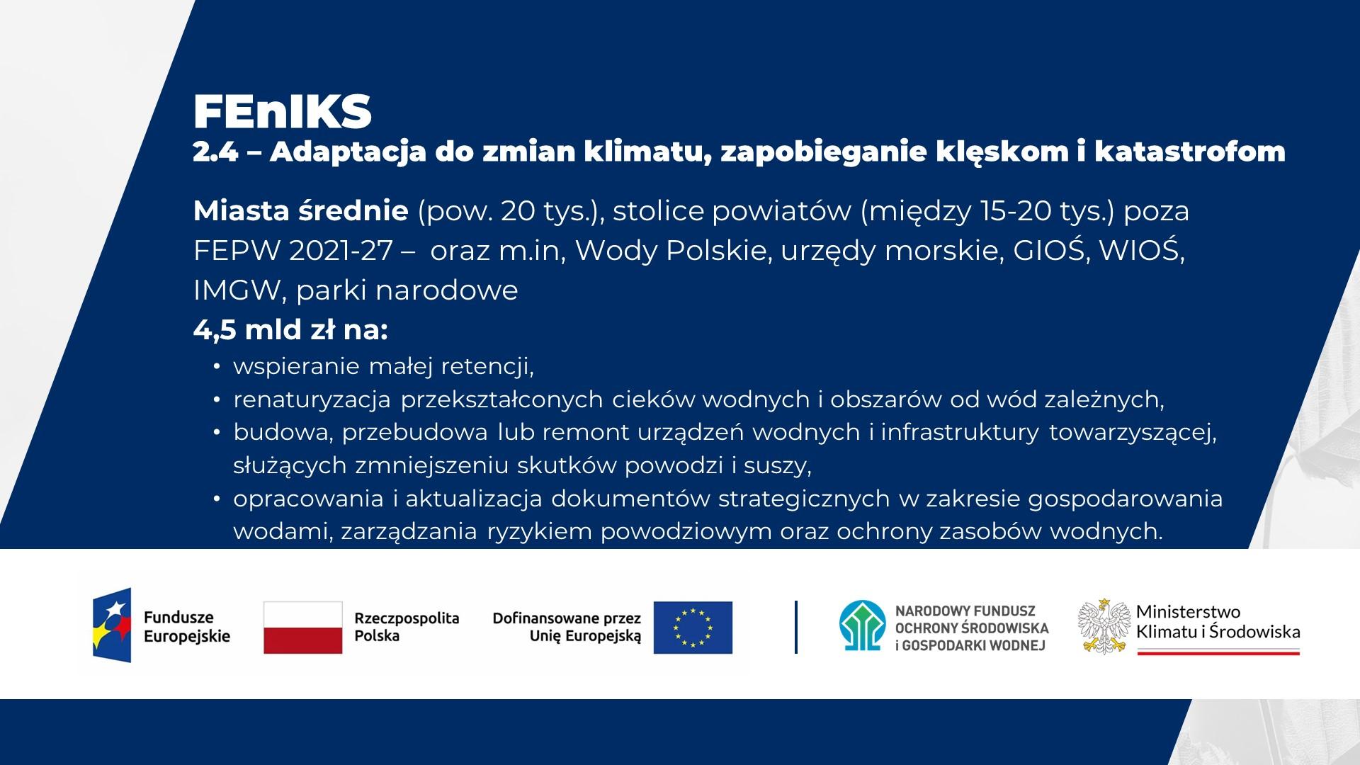 Działanie 2.4: Adaptacja do zmian klimatu, zapobieganie klęskom i katastrofom, miasta średnie (pow. 20 tys.), stolice powiatów (między 15-20 tys.) poza FEPW 2021-27 oraz m.in, Wody Polskie, urzędy morskie, GIOŚ, WIOŚ, IMGW, parki narodowe otrzymają środki na: