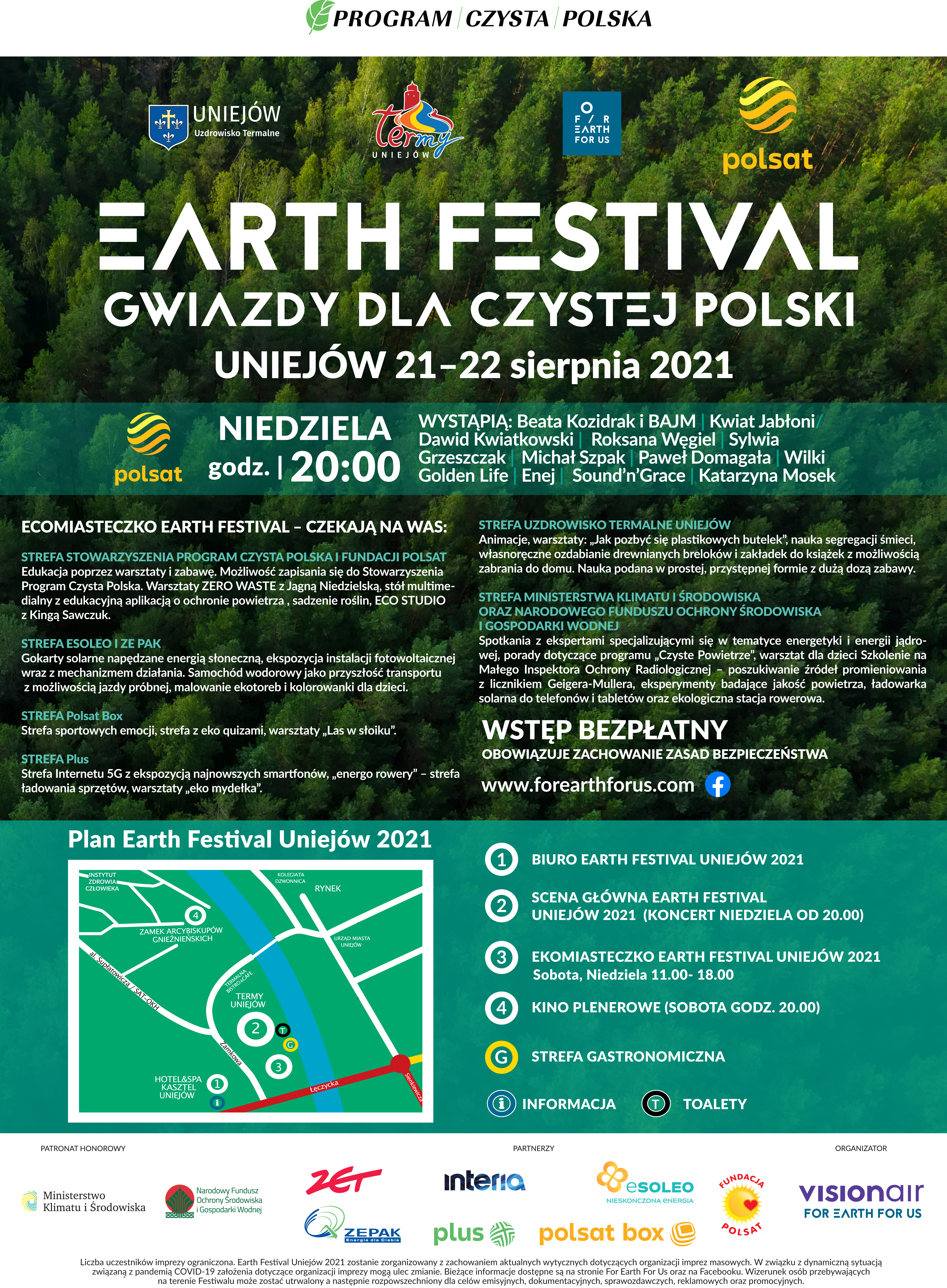 Organizatorami Earth Festival Uniejów 2021 są: Miasto Uniejów, Termy Uniejów, Polsat oraz For EARTH for US.