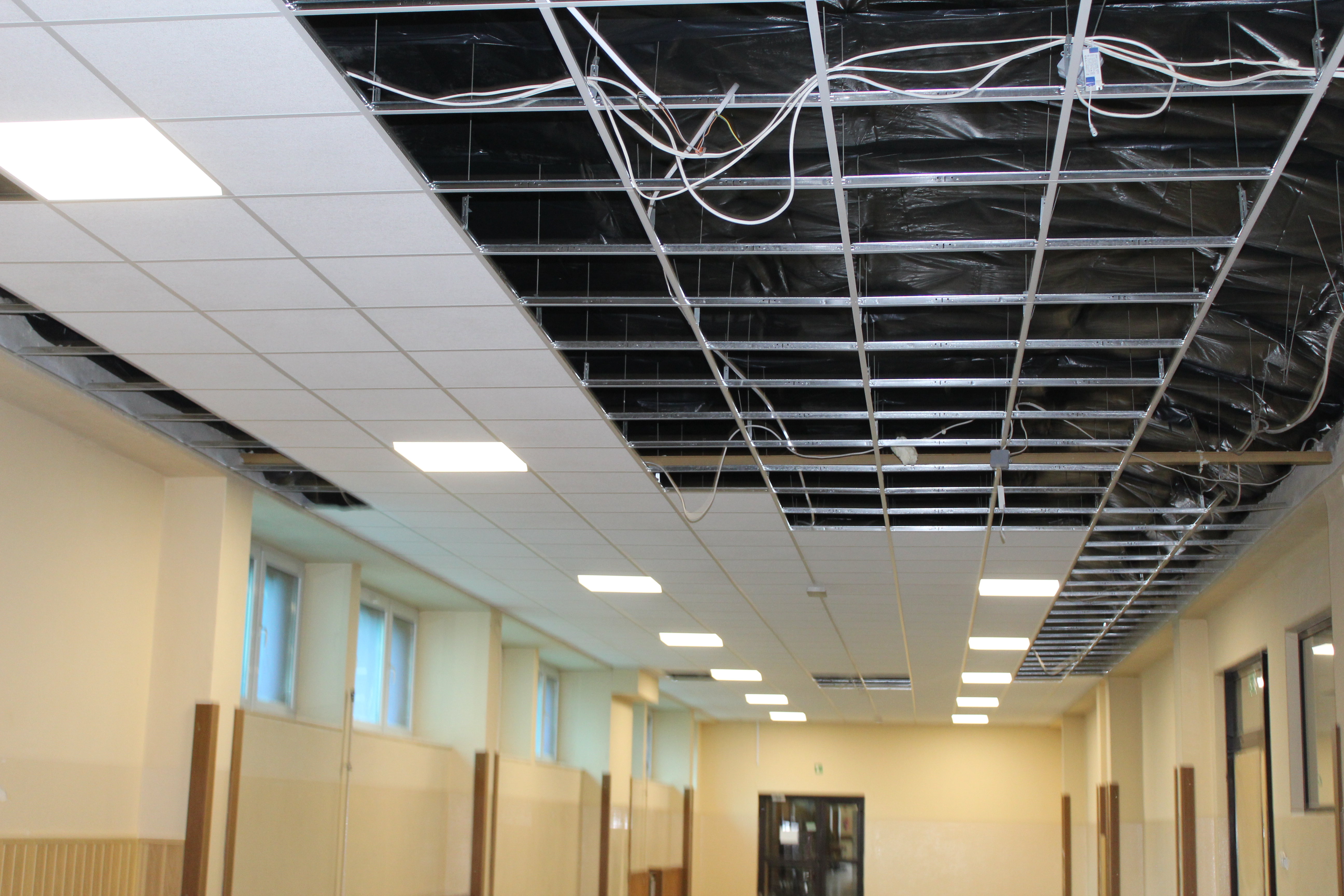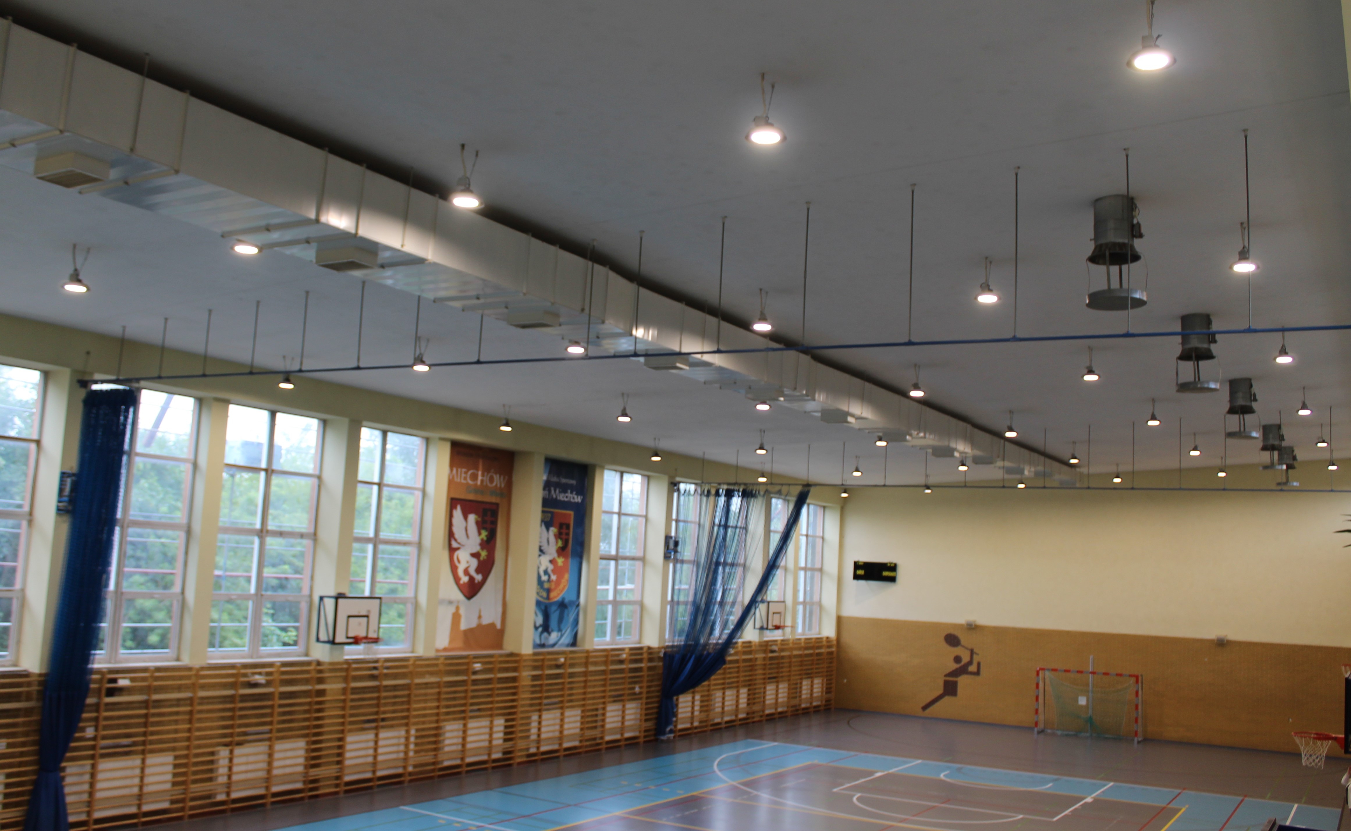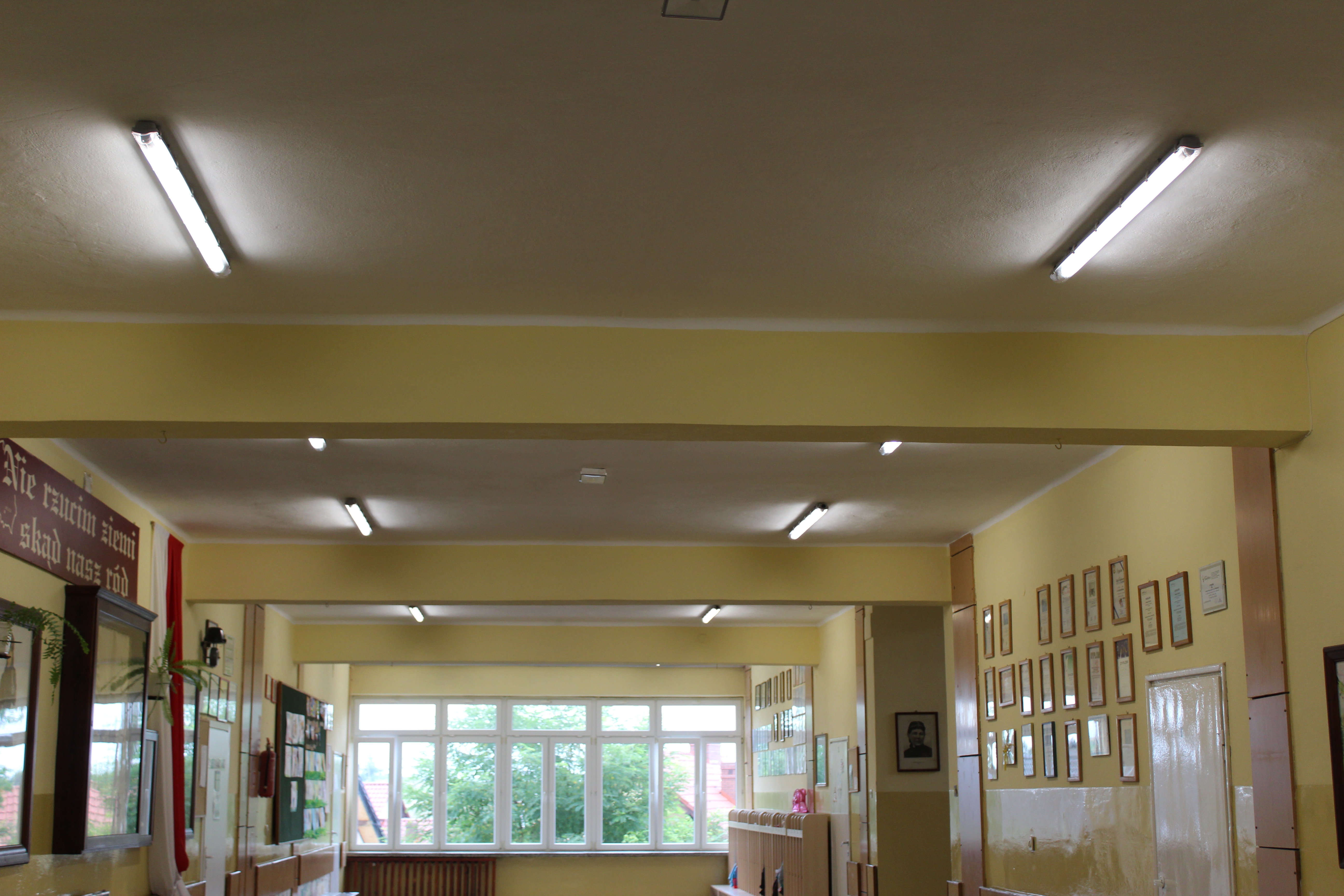 Zakończono realizację kolejnego zadania zaplanowanego w projekcie, które obejmowało wymianę starych opraw oświetleniowych na ledowe. Zmodernizowano oświetlenie podstawowe i awaryjne w salach dydaktycznych i sali konferencyjnej, na korytarzach oraz hali sportowej.
