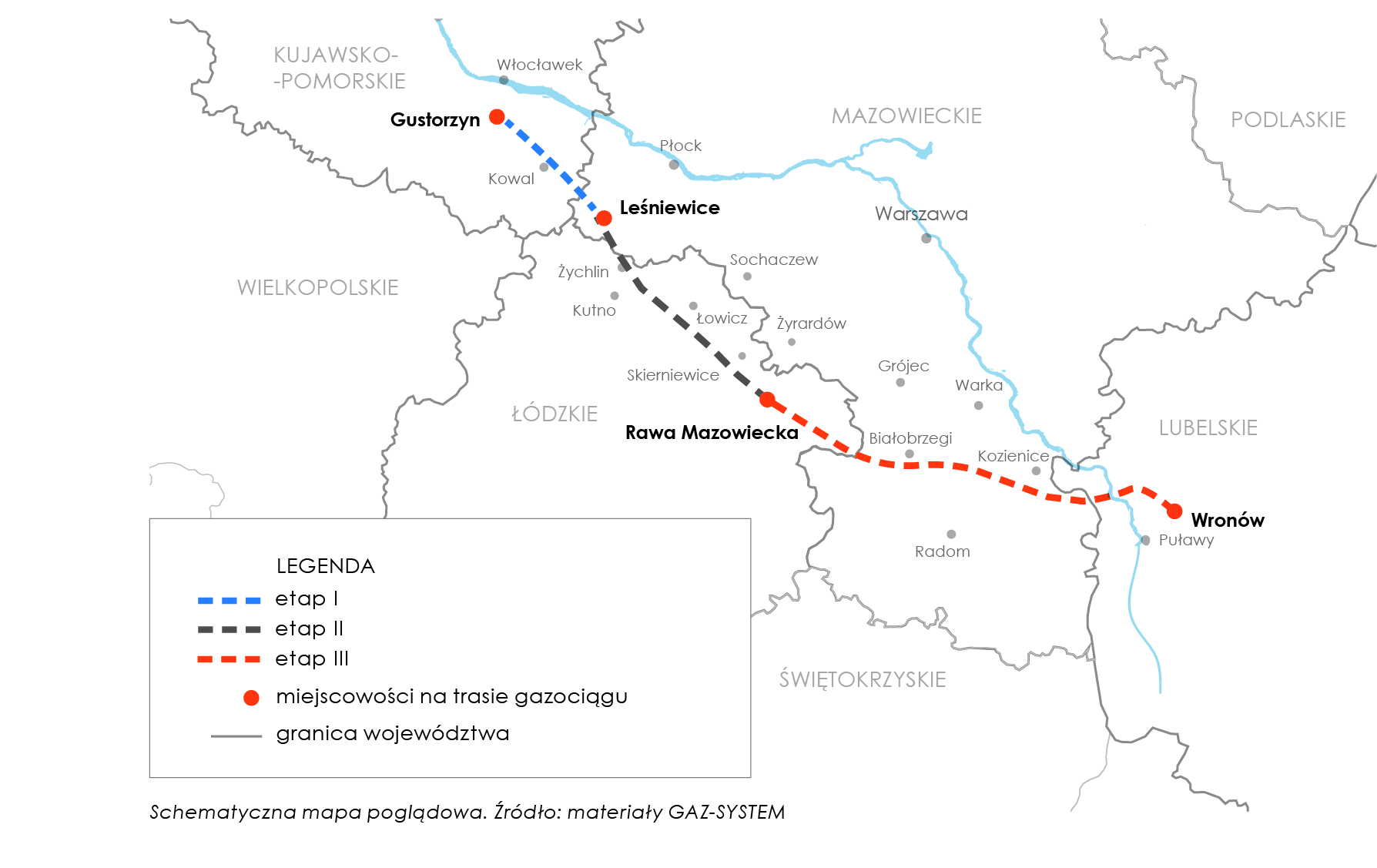- Odciążenie istniejących gazociągów zasilających rejon Warszawy, Łodzi i Radomia, co znacząco wpłynie na bezpieczeństwo pracy oraz uzyskanie możliwości zasilania dodatkowego;