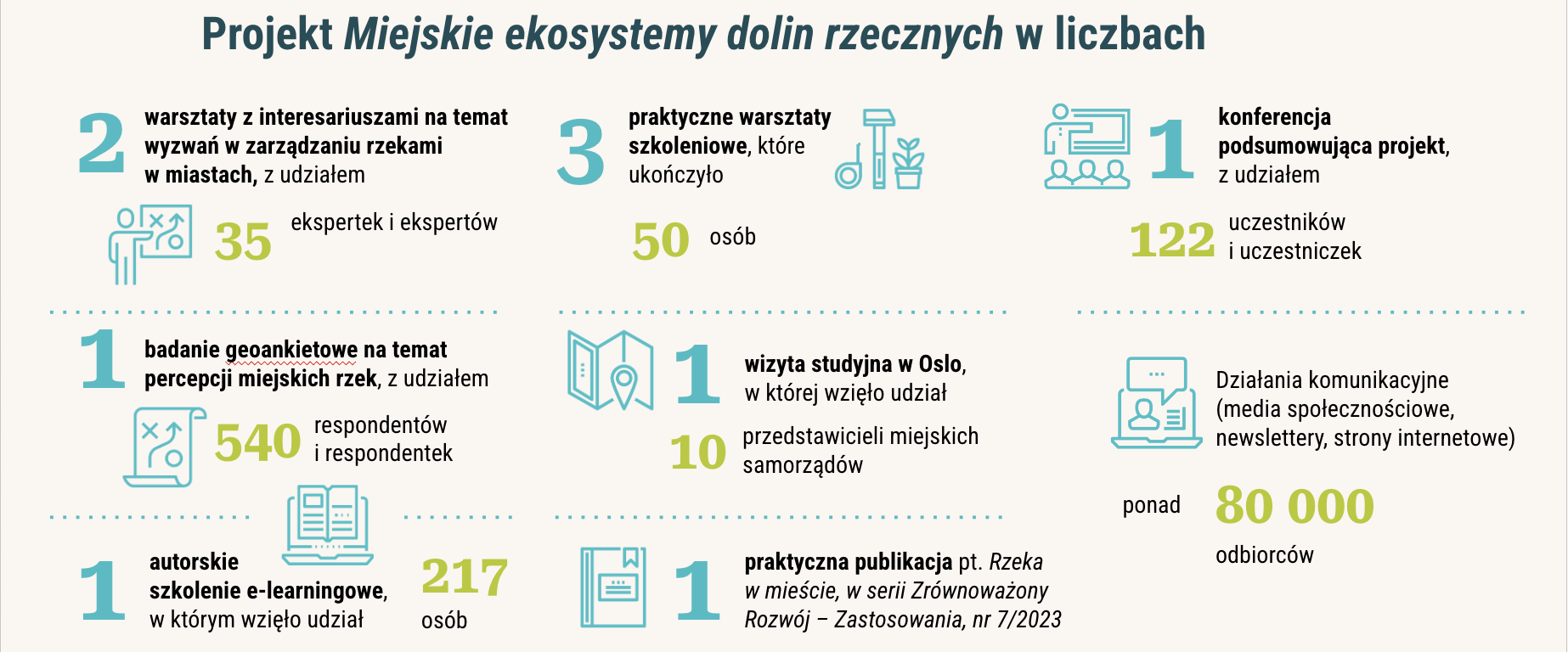 W listopadzie 2023 r. odbyła się dwudniowa konferencja Rzeka w mieście, podsumowująca projekt Miejskie ekosystemy dolin rzecznych. Wzięło w niej udział ponad 120 osób, ekspertów i ekspertek z całej Polski, dzięki czemu stała się przestrzenią do wymiany wiedzy i doświadczeń, upowszechniania dobrych praktyk związanych z zarządzeniem dolinami rzecznymi. Zgodnie z informacjami zawartymi w podsumowaniu konferencji: