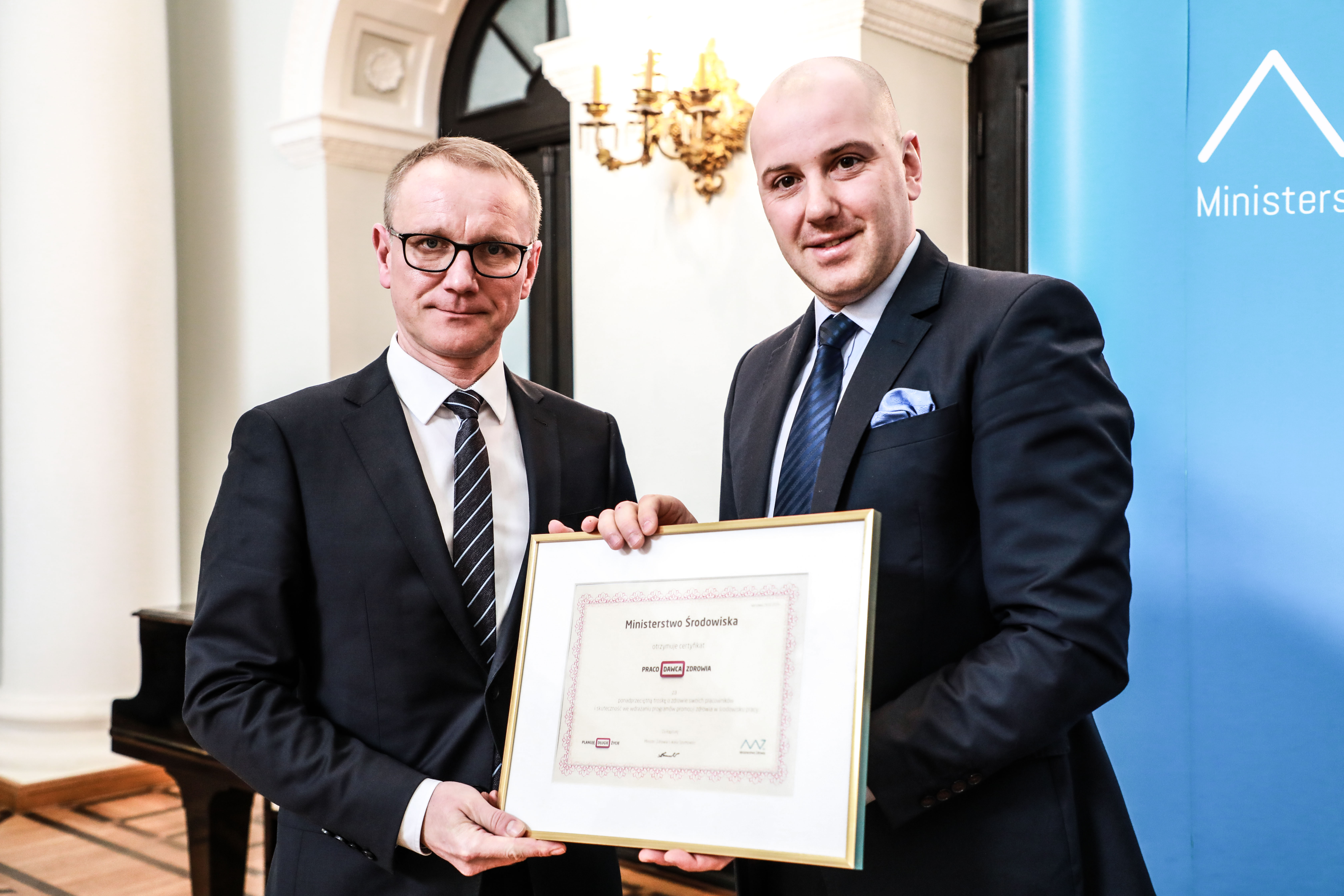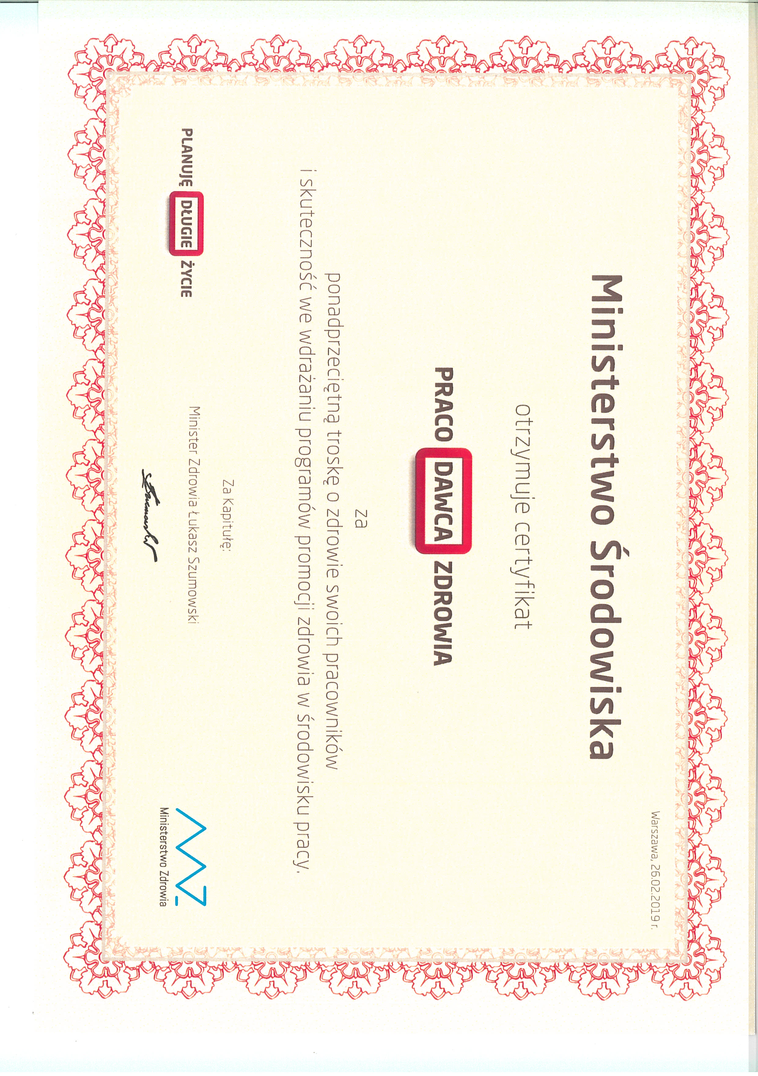 Ministerstwo Środowiska zostało wyróżnione certyfikatem w pierwszej edycji konkursu "PracoDawca Zdrowia". O certyfikat, nadawany przez Ministerstwo Zdrowia, mogą ubiegać się przedsiębiorstwa, instytucje i urzędy, które wykażą ponadprzeciętną troskę o zdrowie swoich pracowników i skuteczność we wdrażaniu programów promocji zdrowia wewnątrz firmy.