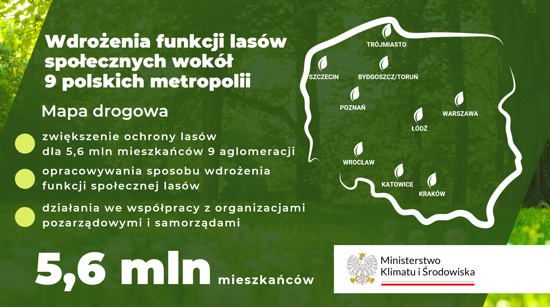 Przygotujemy mapę drogową do tworzenia lasów społecznych dla 9 największych aglomeracji – Warszawa, Łódź, Poznań, Wrocław, Katowice, Kraków, Trójmiasto, Szczecin, Bydgoszcz/Toruń. Chcemy ograniczyć tam wycinki, dając tym lasom nową, wiodącą funkcję – funkcję społeczną. Będą one służyć 5,6 mln okolicznych mieszkańców