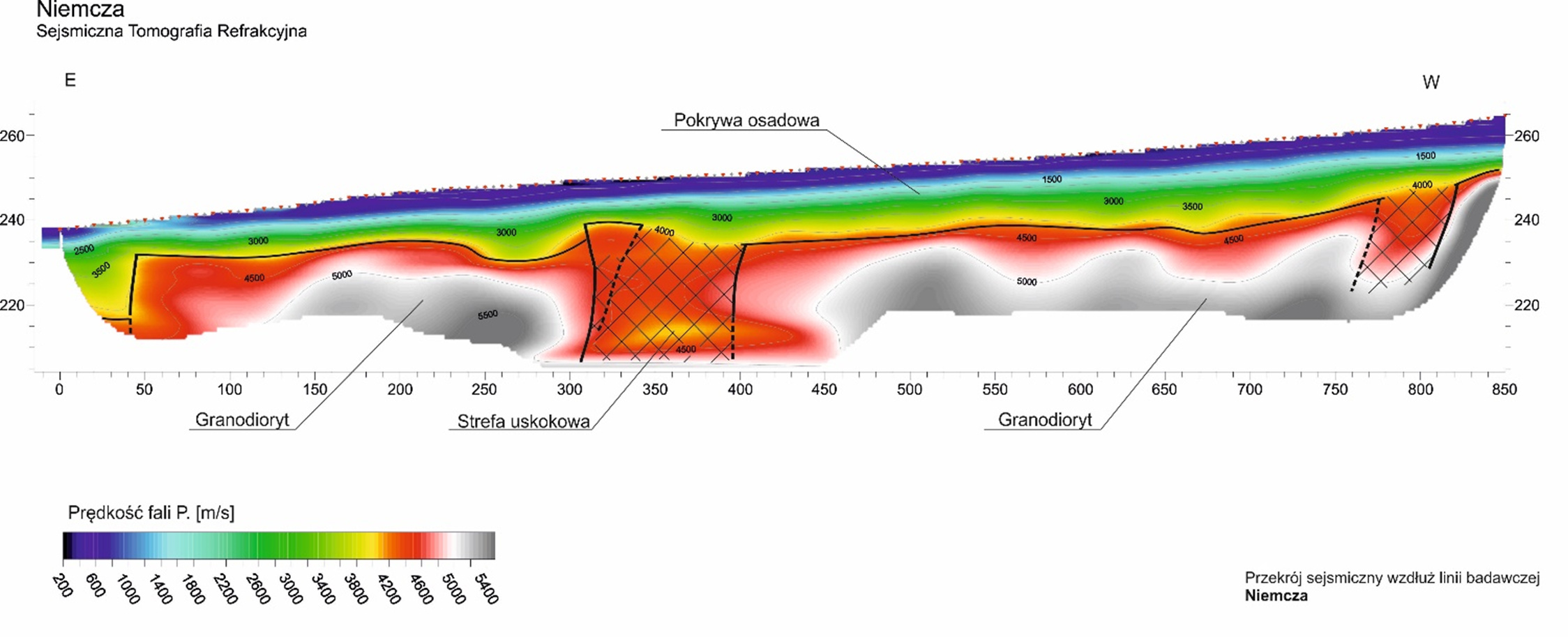 W II etapie zadania, podobnie jak na etapie I, prowadzono prace zmierzające do zlokalizowania i rozpoznania przy użyciu szeregu metod geologicznych i geofizycznych kolejnych wybranych, nieobjętych jeszcze badaniami młodych stref dyslokacyjnych pod kątem potencjalnych możliwości pozyskiwania z nich podziemnych wód termalnych. Przeprowadzono również prace uszczegółowiające i pogłębiające stan rozpoznania strukturalno-hydrogeologicznego niektórych stref tektonicznych wyselekcjonowanych w I etapie zadania. Badania prowadzono metodami, które sprawdziły się na etapie I. Należą do nich: analiza geomorfologiczna, badania sejsmiczne (rycina 1), elektrooporowe, radiometryczne (spektrometryczne), termometryczne, magnetotelluryczne i geochronologiczne. Po doświadczeniach realizacji etapu I, wprowadzono do nich szereg korekt, polegających na poszerzeniu zakresu i metodyki prac sejsmicznych i magnetotellurycznych, zmianie metodyki badań termometrycznych (tak by dostarczyły nowych danych do oszacowania rozkładu temperatur wgłębnych i właściwości termicznych skał na obszarze Dolnego Śląska). Uzupełniono też prace o szczegółowe kartowanie powierzchniowych wystąpień stref tektonicznych dla porównania ze strefami stwierdzanymi jedynie metodami geofizycznymi. Prowadzono również badania petrofizyczne skał ze stref tektonicznych na próbach skalnych i rdzeniach, a także analizę strukturalną archiwalnych danych z zakresu głębokiej sejsmiki poszukiwawczej.