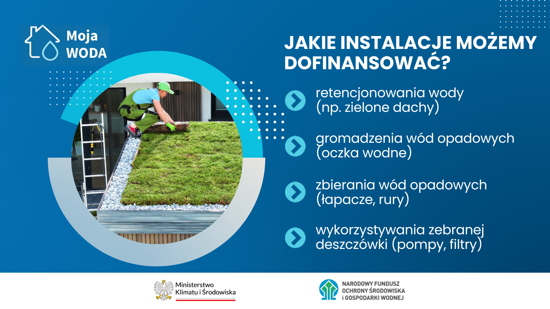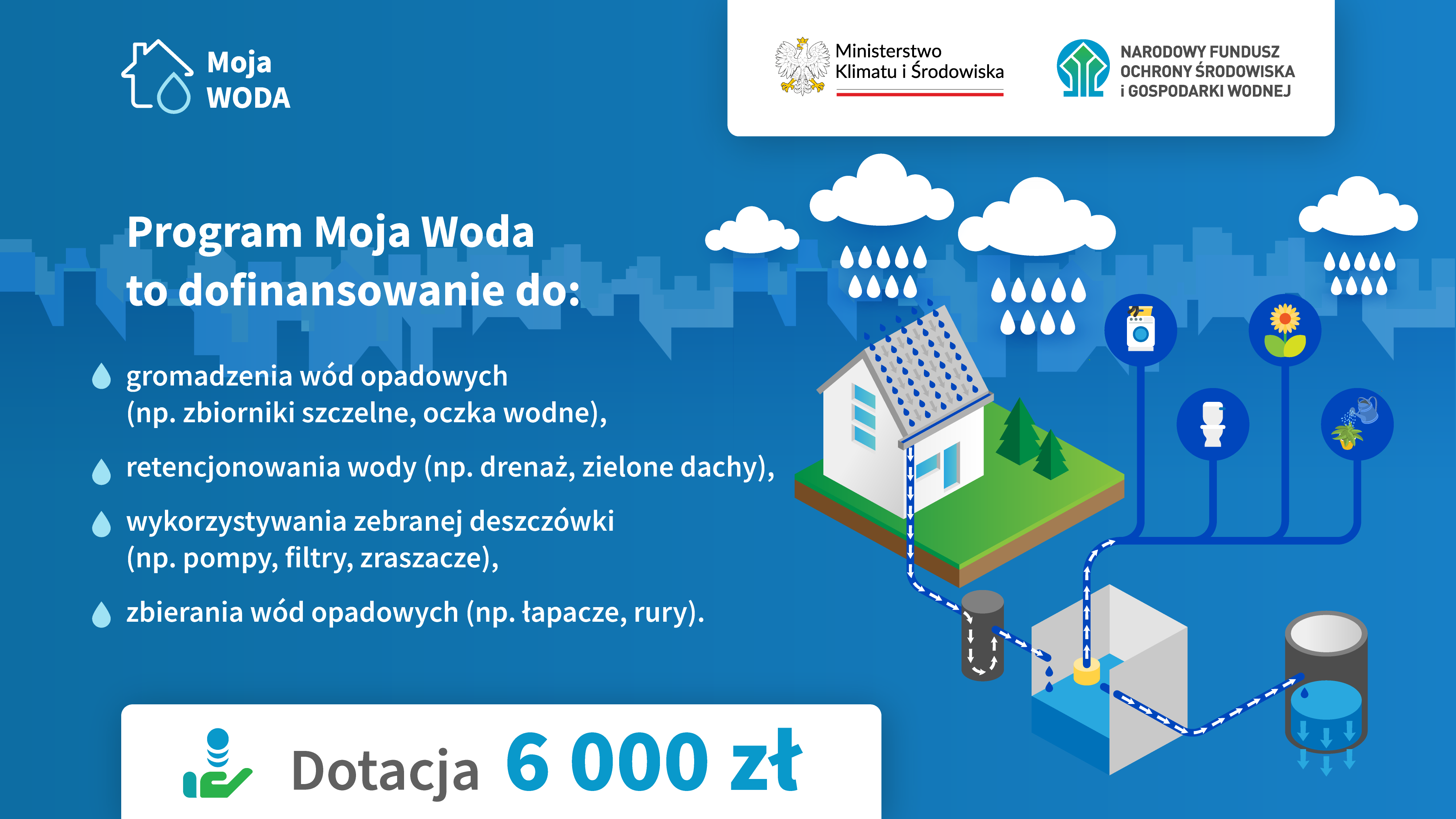 NFOŚiGW realizuje program „Moja Woda” we współpracy z funduszami wojewódzkimi. Właścicielom lub współwłaścicielom nieruchomości z domem jednorodzinnym przekazuje dofinansowanie na instalacje, które pozwalają zatrzymywać deszczówkę w obrębie nieruchomości. Dzięki temu wody opadowe lub roztopowe z posesji nie są odprowadzane poza jej teren (np. do kanalizacji sanitarnej lub deszczowej albo do rowów odwadniających czy na sąsiadujące tereny, ulice i place), lecz służą do nawadniania, podlewania roślin w ogrodach oraz do innych celów bytowych i gospodarczych.