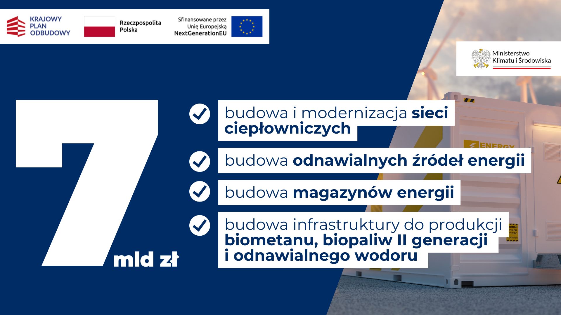 Wsparcie uzyskają inwestycje, których celem będzie zwiększenie efektywności energetycznej, a także budowa odnawialnych źródeł energii, zarówno w sektorze elektroenergetyki, jak i ciepłownictwa, budowa magazynów energii, infrastruktury do produkcji biometanu i odnawialnego wodoru czy budowa i modernizacja sieci ciepłowniczych i gazowych.