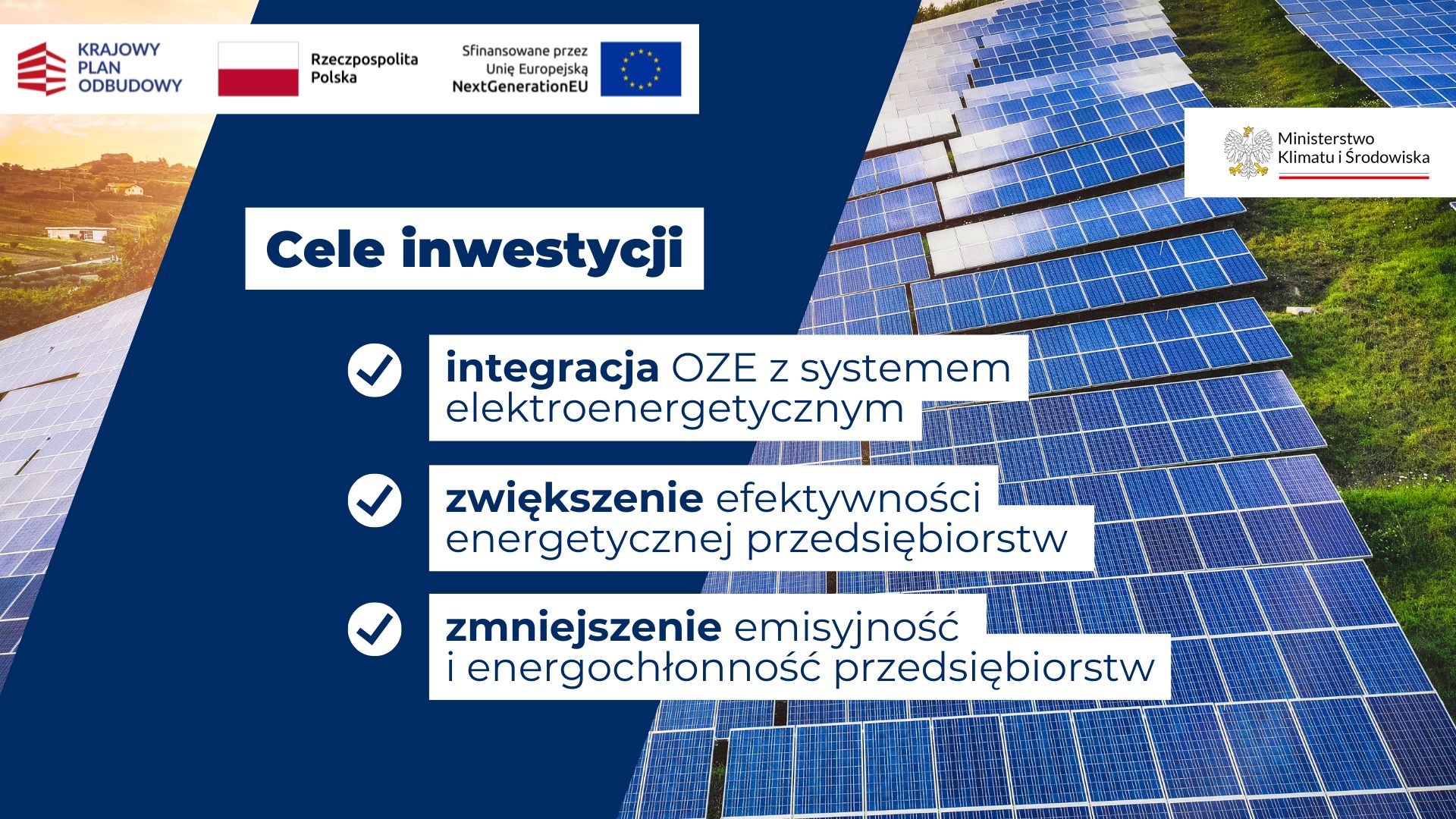 Celem wsparcia jest przyspieszenie procesu dekarbonizacji poprzez odchodzenie od paliw kopalnych na rzecz zeroemisyjnych i odnawialnych źródeł energii, integracja OZE z systemem elektroenergetycznym, a także poprawa efektywności energetycznej oraz rozwój zielonego przemysłu i innowacji.