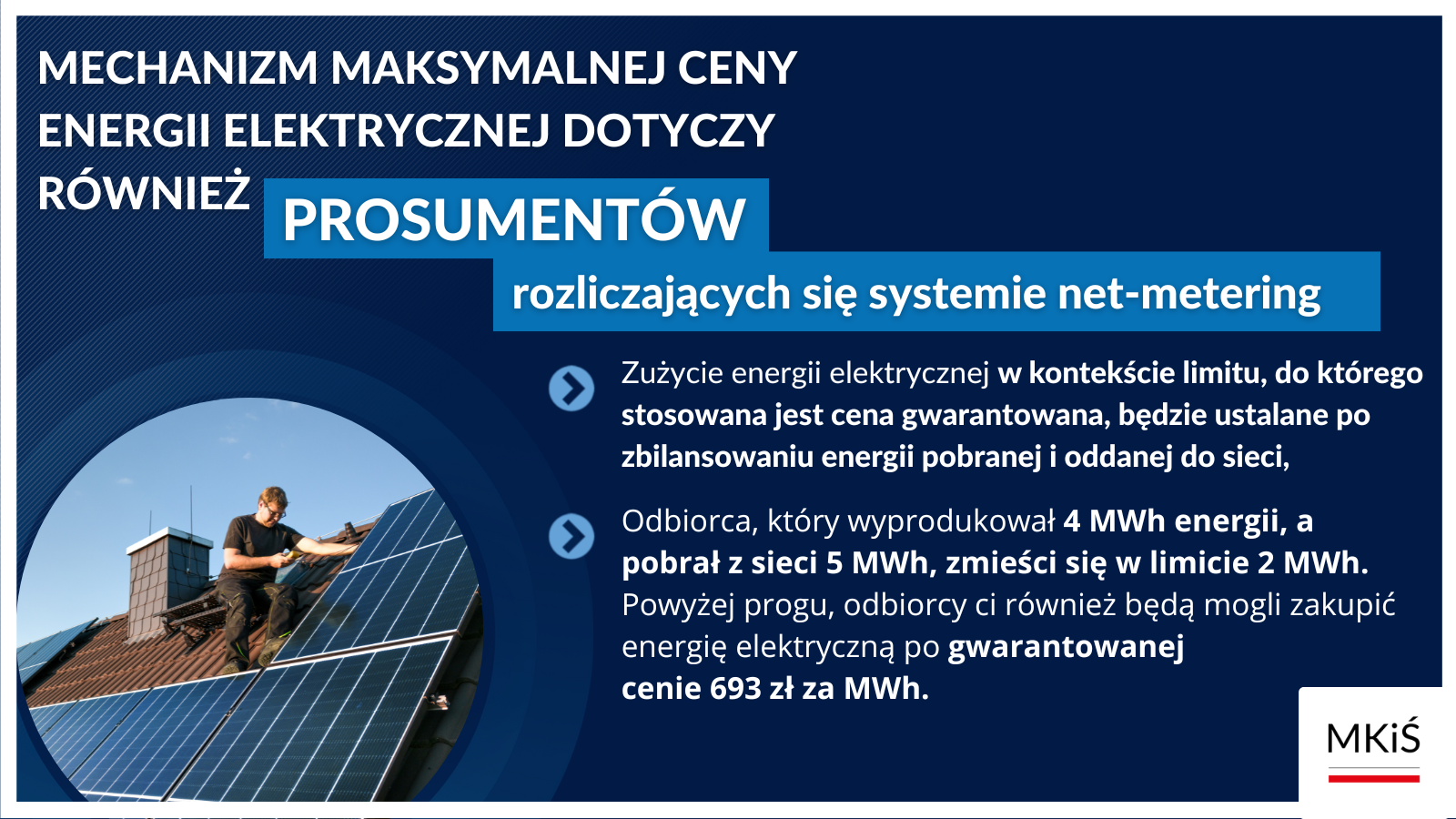 Zużycie energii elektrycznej prosumentów rozliczających się w ramach net-meteringu, w kontekście limitu, do którego stosowana jest cena gwarantowana, będzie ustalane po zbilansowaniu energii pobranej i oddanej do sieci (tj. po rozliczeniu zgodnie z zasadami wskazanymi w art. 4 ust 1 ustawy z dnia 20 lutego 2015 r. o odnawialnych źródłach energii). Dla przykładu, odbiorca, który wyprodukował 4 MWh energii, a pobrał z sieci 5 MWh, zmieści się w limicie 2 MWh. Powyżej progu, odbiorcy ci również będą mogli zakupić energię elektryczną po gwarantowanej cenie 693 zł za MWh.