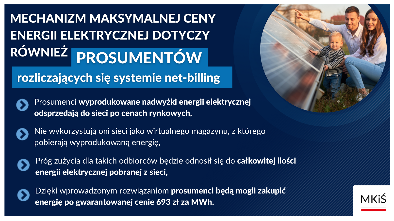 Prosumenci rozliczający się w ramach net-billingu, wyprodukowane nadwyżki energii elektrycznej odsprzedają do sieci po cenach rynkowych. Nie wykorzystują oni sieci jako wirtualnego magazynu, z którego pobierają wyprodukowaną energię (jak ma to miejsce w rozliczeniach na zasadzie net-meteringu). Wobec tego, próg zużycia dla takich odbiorców będzie odnosił się do całkowitej ilości energii elektrycznej pobranej z sieci. Powyżej progu, odbiorcy ci, dzięki rozwiązaniom zawartym w ustawie o środkach nadzwyczajnych mających na celu ograniczenie wysokości cen energii elektrycznej oraz wsparciu niektórych odbiorców w 2023 r., będą mogli ją zakupić po gwarantowanej cenie 693 zł za MWh.