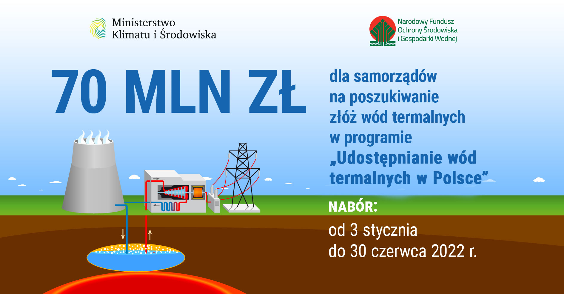 70 mln zł dla samorządów lub ich związków przeznaczy Narodowy Fundusz Ochrony Środowiska i Gospodarki Wodnej na przedsięwzięcia w zakresie poszukiwania i rozpoznawania złóż wód termalnych. Nabór w ramach drugiego konkursu programu priorytetowego „Udostępnianie wód termalnych w Polsce” odbędzie się w terminie od 3 stycznia do 30 czerwca 2022 r.