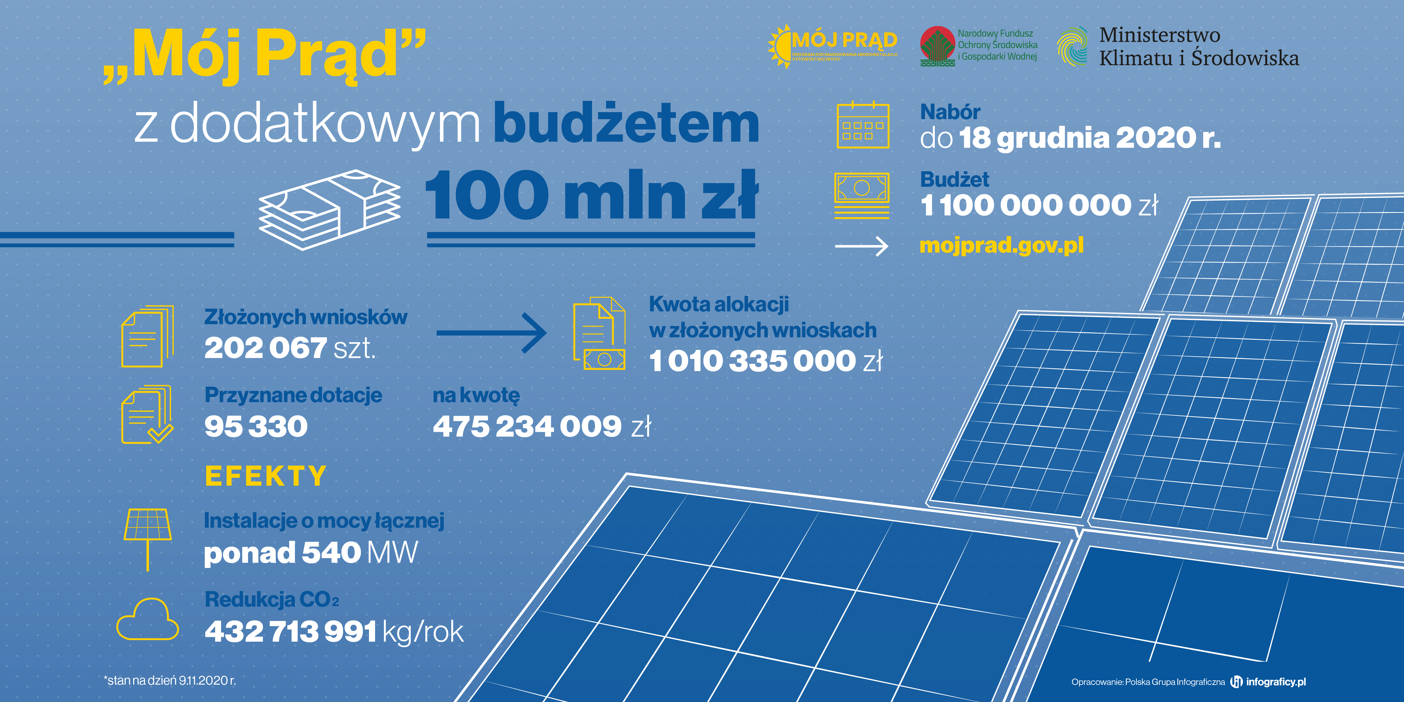 „Wychodząc naprzeciw oczekiwaniom naszych wnioskodawców i wywiązując się z obietnicy zakończenia naboru dopiero za nieco ponad miesiąc, zdecydowaliśmy wspólnie z Ministerstwem Klimatu i Środowiska o zwiększeniu puli dostępnych środków w „Moim Prądzie”. Dodatkowe 100 mln zł, to szansa dla kolejnych 20 tys. osób” – dodaje wiceprezes NFOŚiGW Paweł Mirowski.