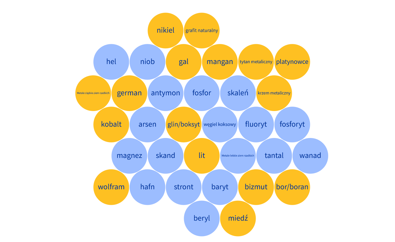 Spośród 34 zidentyfikowanych surowców krytycznych 17 trafiło na listę surowców strategicznych (oznaczone poniżej na żółto). Popyt na nie ma rosnąć wykładniczo, a ich produkcja jest złożona, dlatego istnieje wyższe ryzyko wystąpienia problemów z podażą. Lista ta będzie regularnie weryfikowana.