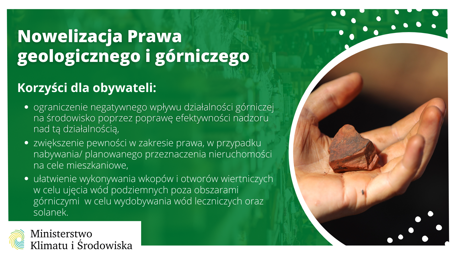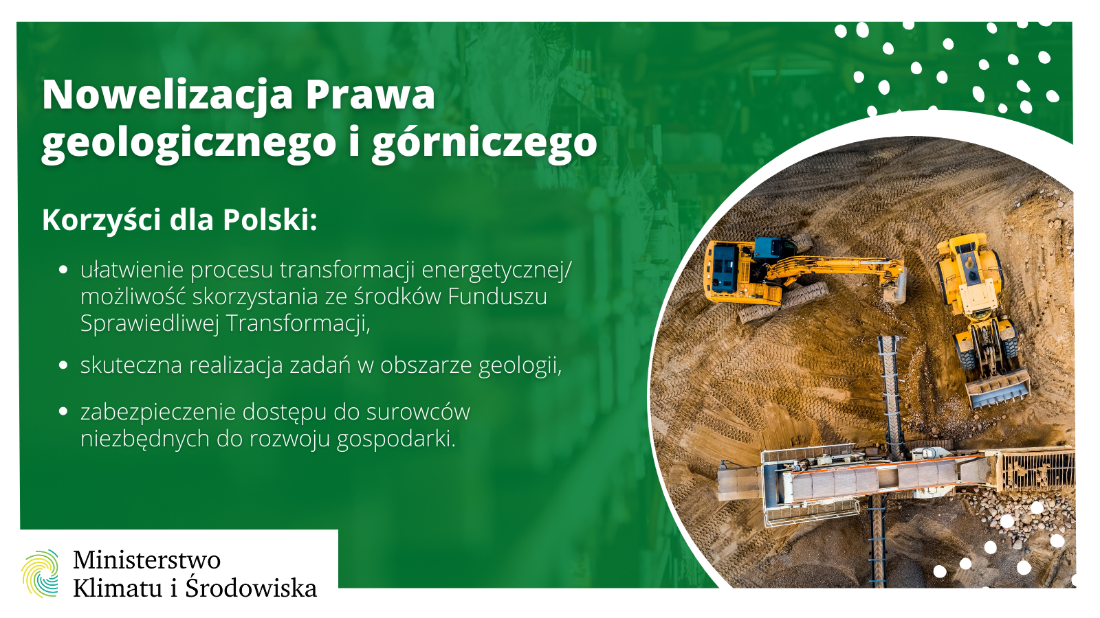 Do korzyści dla kraju zaliczyć można ułatwienie procesu transformacji energetycznej, w tym otwarcie możliwości skorzystania ze środków Funduszu Sprawiedliwej Transformacji dla nowych regionów. Wprowadzone zmiany zabezpieczą dostęp do surowców niezbędnych do rozwoju gospodarki. Nowelizacja pozwoli też na skuteczniejszą realizację zadań państwa w obszarze geologii.