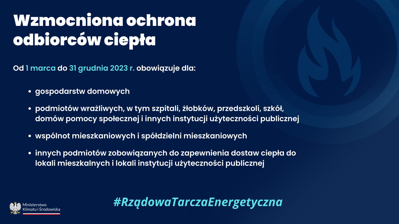 Ministerstwo Klimatu i Środowiska przypomina, że od 1marca do 31 grudnia 2023 r., obowiązuje wzmocniona ochrona odbiorców ciepła dla gospodarstw domowych, podmiotów wrażliwych, wspólnot mieszkaniowych i spółdzielni mieszkaniowych i innych podmiotów zobowiązanych do zapewnienia dostaw ciepła do lokali mieszkalnych i lokali instytucji użyteczności publicznej.