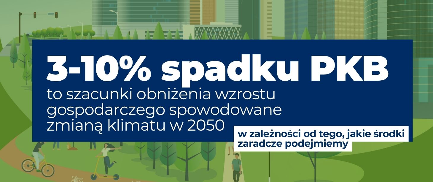 By dokładnie poznać przyszłe wyzwania, prowadzimy prace nad aktualizacją scenariuszy zmiany klimatu, oceną jej skutków oraz analizą przyszłego ryzyka klimatycznego [link]. Szacunki wskazują, że do 2050 roku zmiana klimatu może obniżyć polskie PKB o 3–10%, w zależności od tego, jakie środki zaradcze podejmiemy [link].