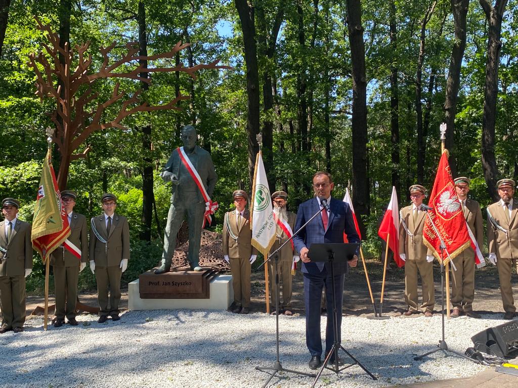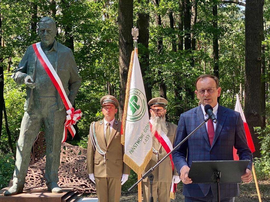 „Śp. Jan Szyszko był leśnikiem kochającym przyrodę. Bardzo chętnie dzielił się swoją wielką wiedzą i pasją. Na zawsze pozostanie w naszej pamięci jako wspaniały człowiek, oddany polskim sprawom” - powiedział wiceminister Edward Siarka podczas uroczystości odsłonięcia pomnika prof. Jana Szyszko, która odbyła się 27 czerwca 2022 r. w Jarocinie.