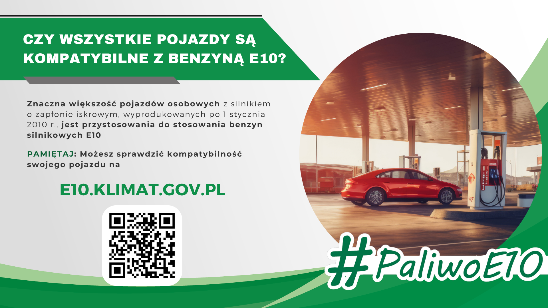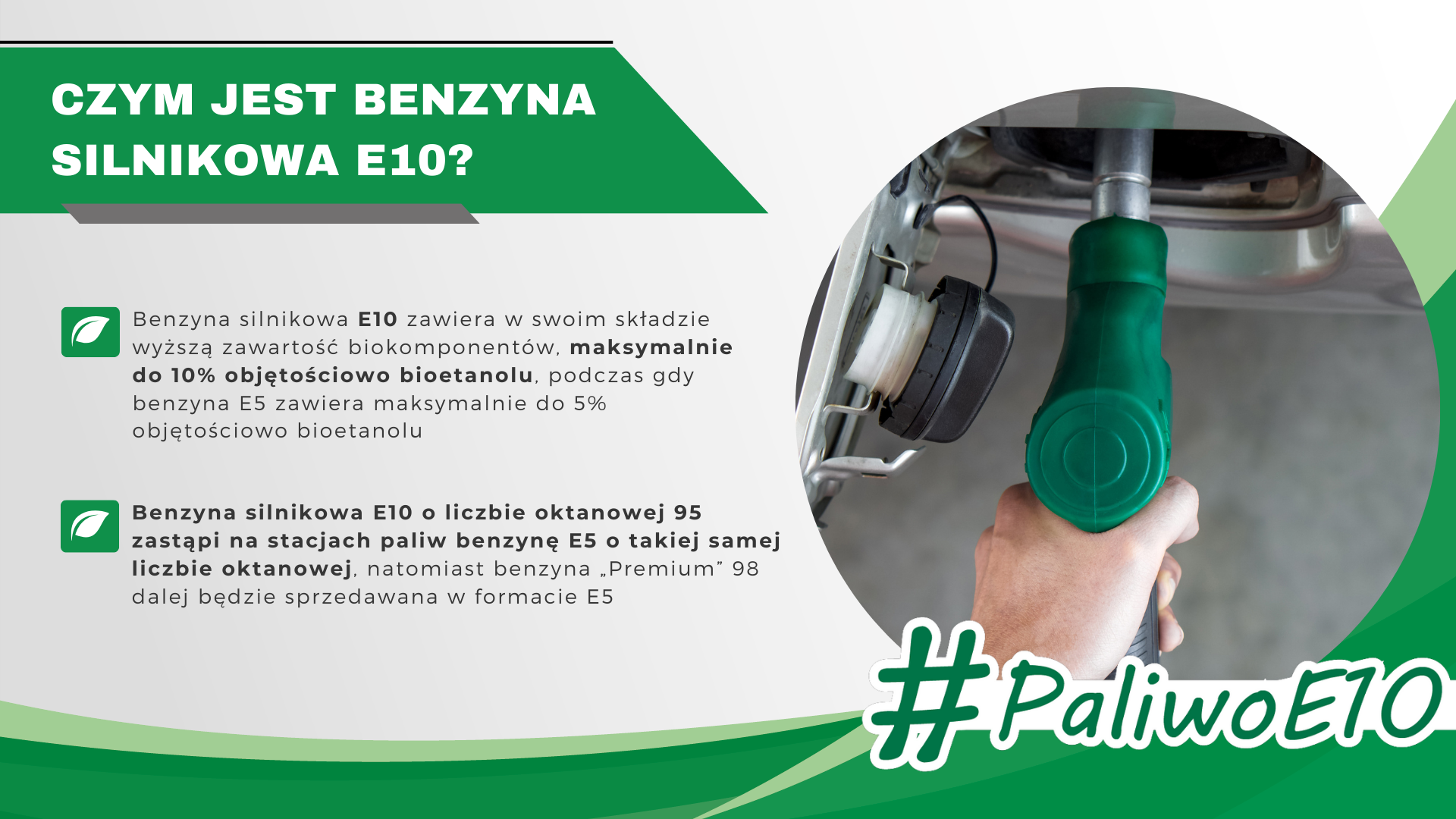Od 1 stycznia 2024 r. na stacjach paliw w Polsce będzie wprowadzane sukcesywnie nowe paliwo - benzyna silnikowa 95-oktanowa z zawartością do 10% biokomponentów – tzw. E10. Benzyna silnikowa E10 zastąpi na stacjach paliw benzynę E5 o liczbie oktanowej 95. Benzyna silnikowa E5, która zostanie zastąpiona benzyną E10, zawiera maksymalnie do 5% objętościowo biokomponentów (bioetanolu), podczas gdy benzyna E10 będzie zawierała maksymalnie do 10% objętościowo biokomponentów. Ta zmiana nie wymaga dodatkowych działań od większości właścicieli pojazdów. W dokumentach pojazdu lub na klapie wlewu paliwa w samochodzie powinno znajdować się charakterystyczne oznaczenie E10 – potwierdzające dostosowanie samochodu do nowego paliwa. Właściciele starszych pojazdów powinni sprawdzić, czy ich pojazdy są dostosowane do tankowania nowego paliwa.