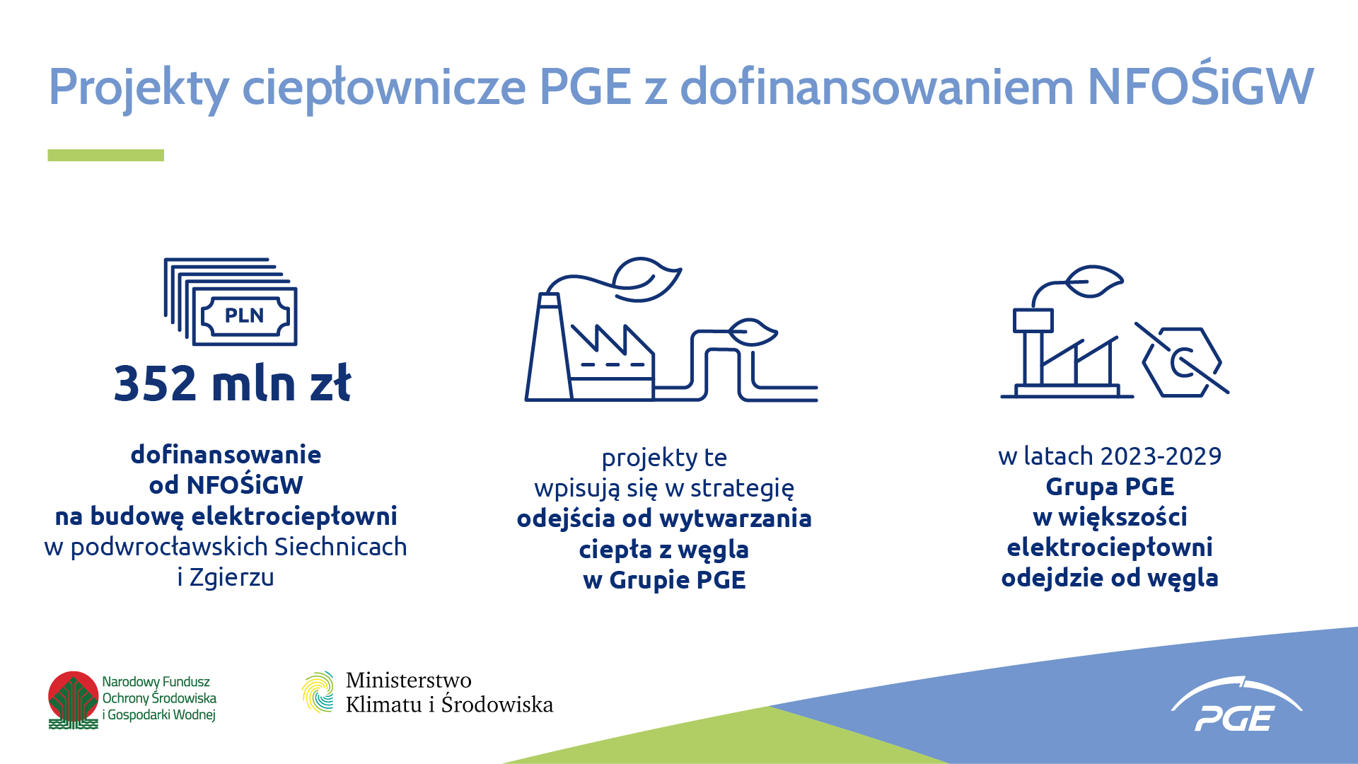 Zarząd PGE Energia Ciepła oraz Zespół Elektrociepłowni Wrocławskich KOGENERACJA z Grupy PGE w obecności Anny Moskwy - Minister Klimatu i Środowiska, podpisał trzy umowy z Narodowym Funduszem Ochrony Środowiska i Gospodarki Wodnej (NFOŚiGW) na dofinansowanie budowy elektrociepłowni w Siechnicach oraz Zgierzu. Wydarzenie odbyło się 10 grudnia w Ministerstwie Klimatu i Środowiska. Łączna kwota udzielonego finansowania preferencyjnego wynosi blisko 352 mln zł.