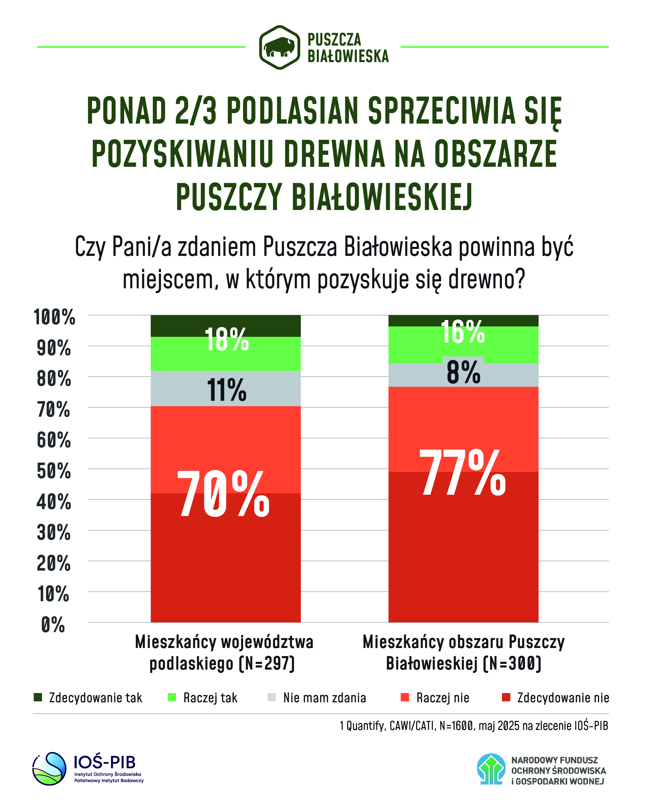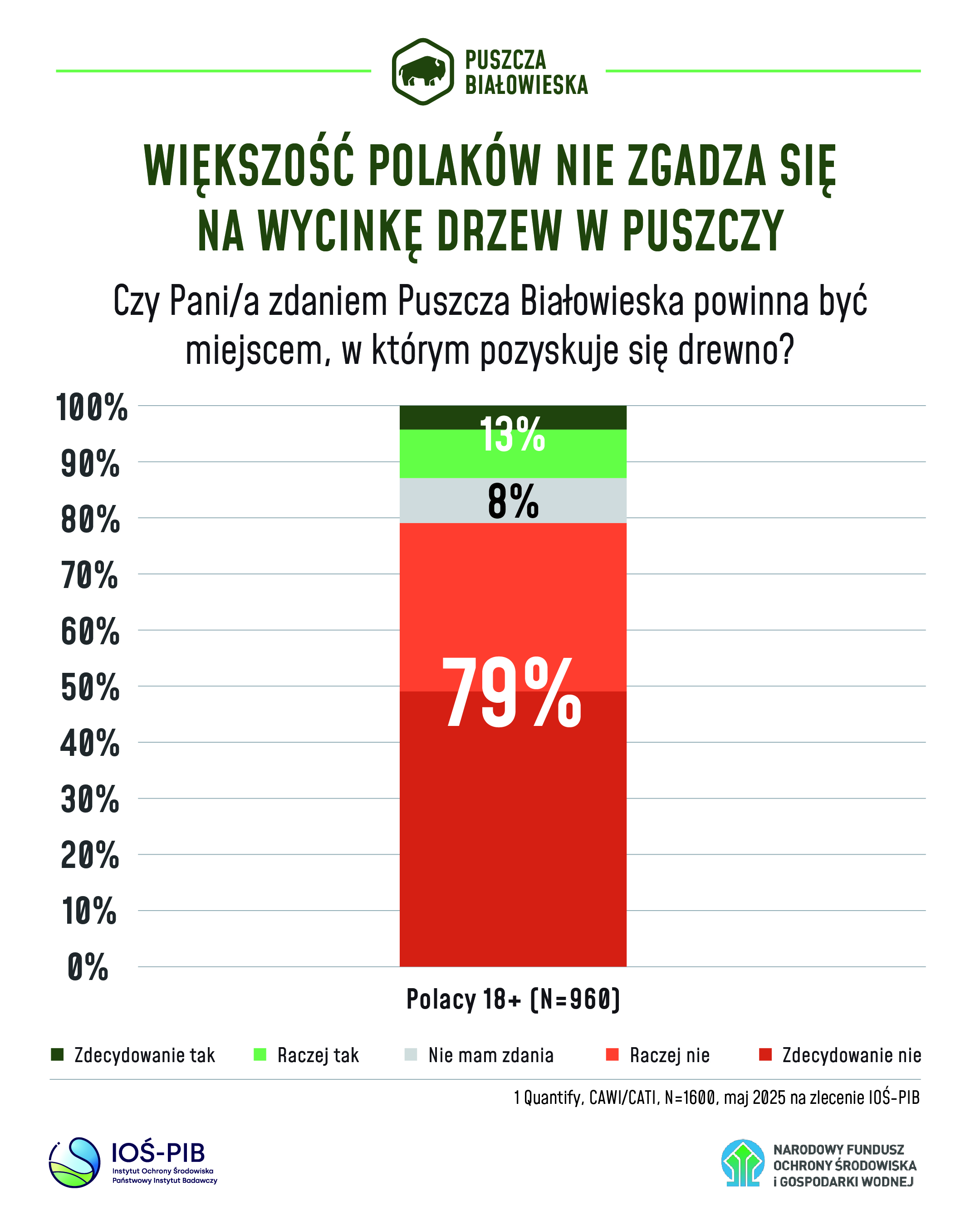 • Polki i Polacy chcą chronić Puszczę – jak pokazuje ogólnopolskie badanie opinii publicznej, ponad 90% respondentów popiera ograniczenie ingerencji człowieka w ten wyjątkowy ekosystem, a ponad 70% sprzeciwia się pozyskiwaniu drewna i polowaniom.