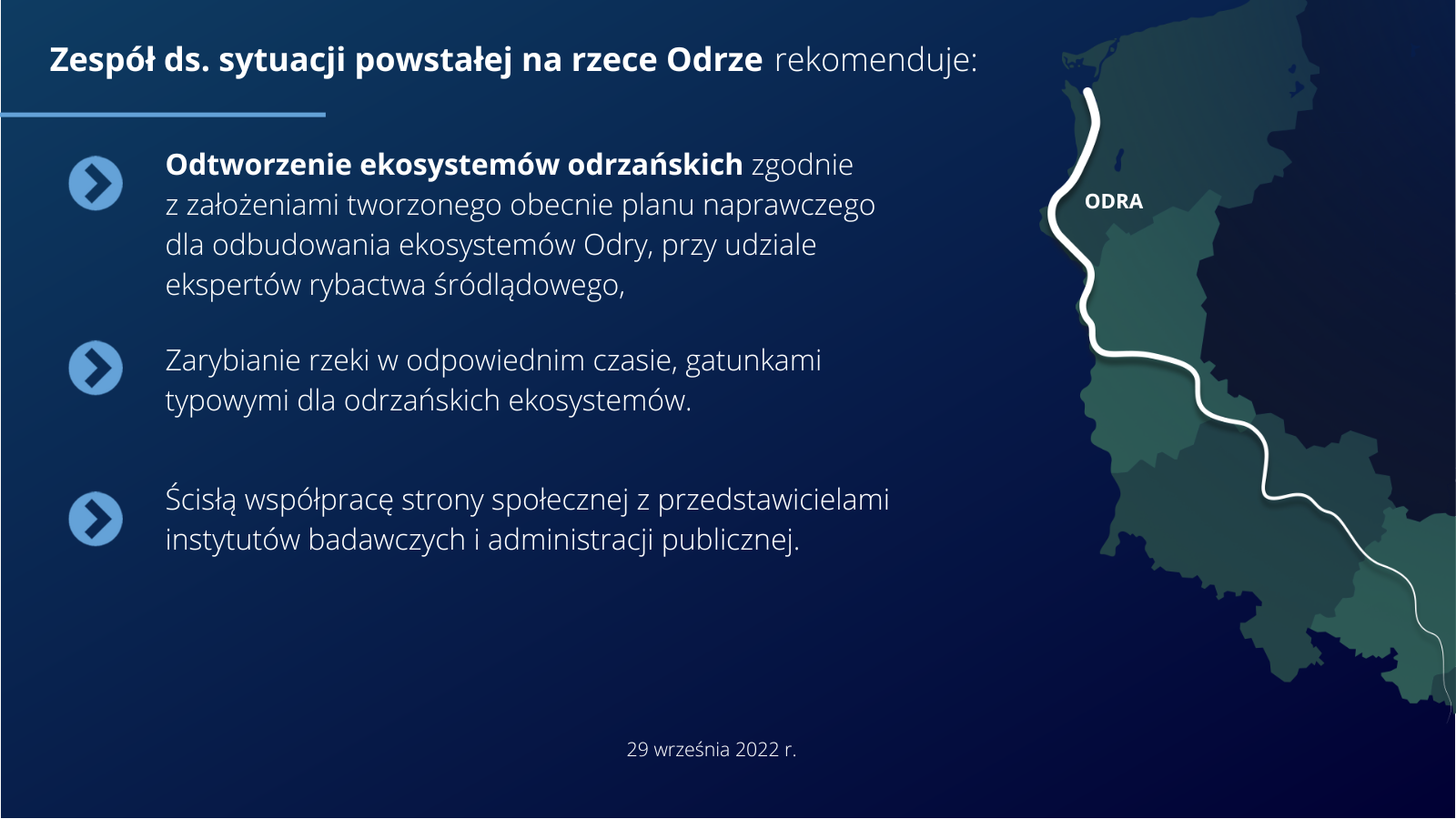 Eksperci z powołanego przez minister klimatu i środowiska Zespołu do spraw sytuacji powstałej na rzece Odrze 29 września 2022 r. podsumowali prace nad ostateczną wersją raportu. Blisko 300-stronicowy dokument zawierający analizy, wyniki badań i przypisy naukowe, zgodnie z zapowiedziami zostanie opublikowany 30 września.