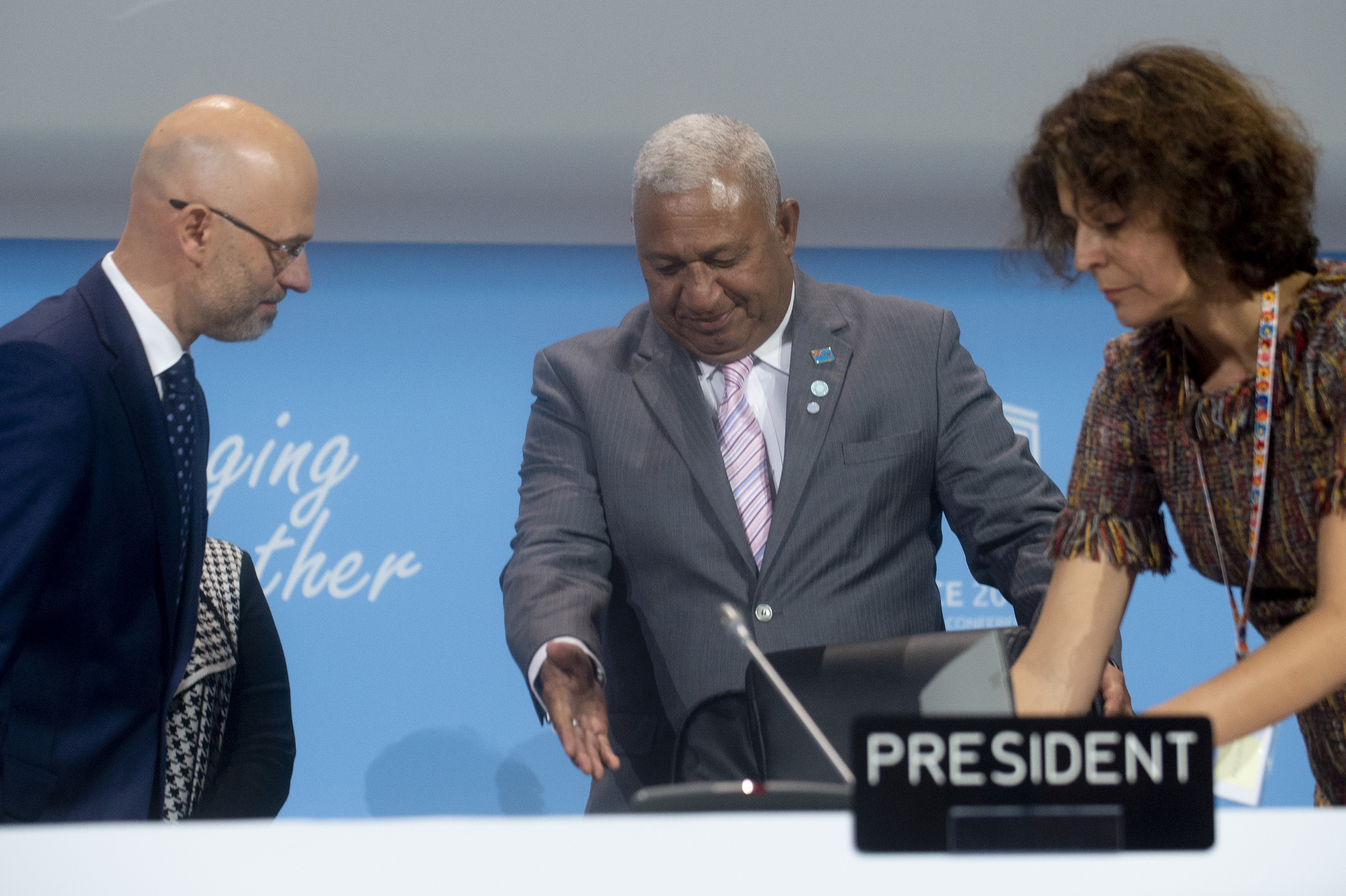 Prezydencja COP tradycyjnie trwa rok, a zmiana pełniącego funkcję prezydenta COP bezpośrednio poprzedza kolejny szczyt klimatyczny. Do dzisiejszego poranka obowiązek ten pełnił Frank Bainimarama, premier Fidżi – gospodarz poprzedniej konferencji. Symbolicznie przekazał swoją funkcję i prerogatywy Michałowi Kurtyce, wręczając mu młotek, będący atrybutem prezydenta COP.