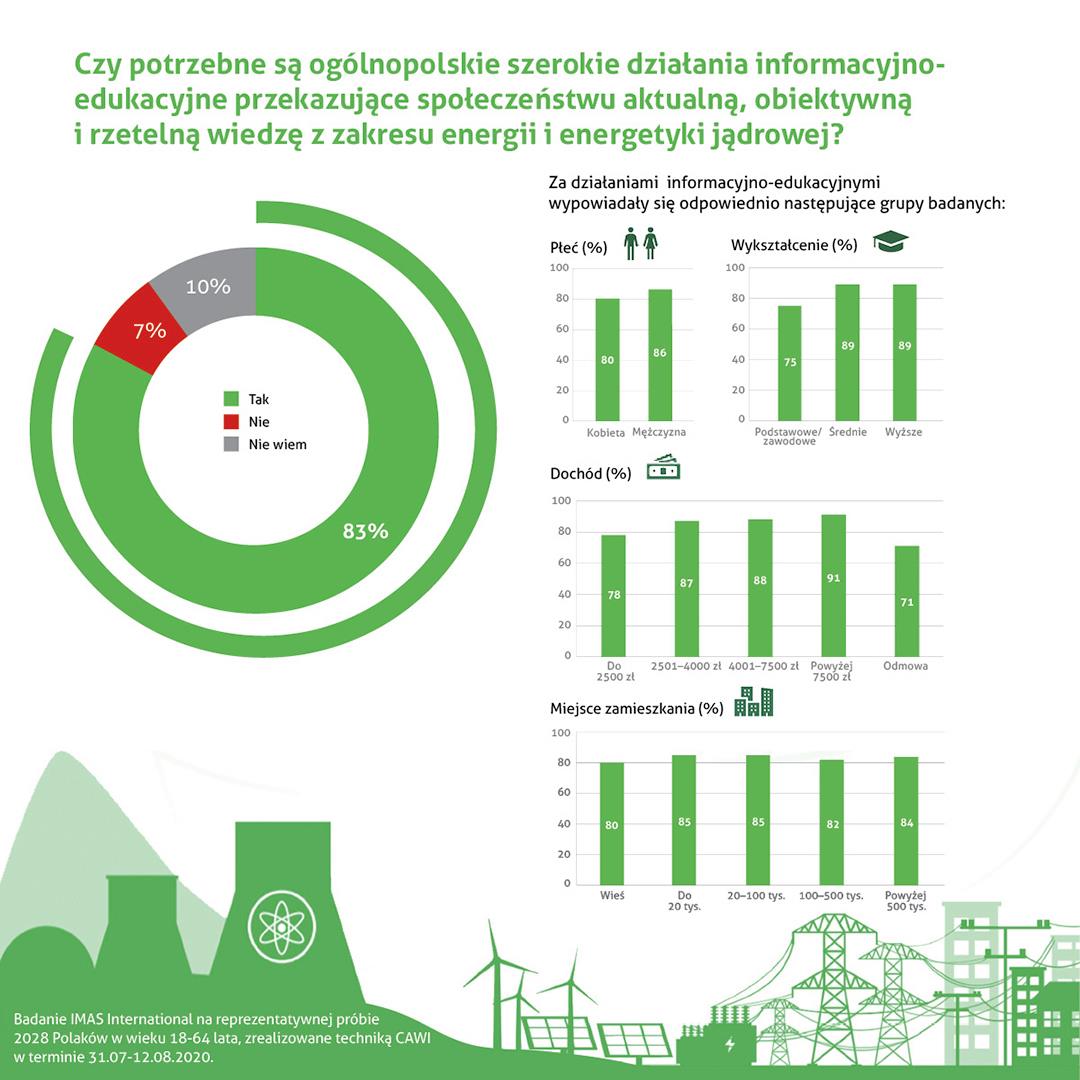 83 proc. badanych uznała, że potrzebne są ogólnopolskie szerokie działania informacyjno-edukacyjne przekazujące społeczeństwu aktualną, obiektywną i rzetelną wiedzę z zakresu energii i energetyki jądrowej. Tylko 7 proc. uznało, że takie działania są niepotrzebne a 10 proc. nie miało w tej kwestii zdania.