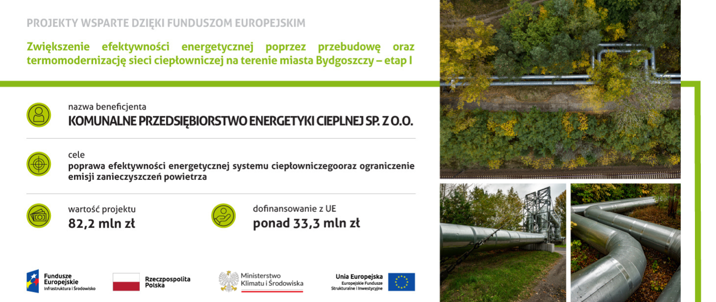 Tytuł projektu: „Zwiększenie efektywności energetycznej poprzez przebudowę oraz termomodernizację sieci ciepłowniczej na terenie miasta Bydgoszczy – etap I”.
