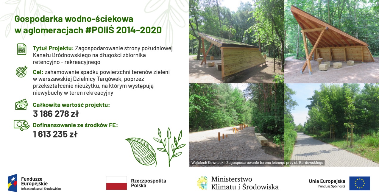 Przedstawiamy projekt pn. „Zagospodarowanie strony południowej Kanału Bródnowskiego na długości zbiornika retencyjno-rekreacyjnego” realizowany przez Miasto Stołeczne Warszawa.