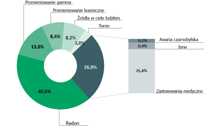 Promieniowanie jonizujące jest zjawiskiem, które od zawsze występuje w otaczającym nas środowisku. Takie, które pochodzi ze źródeł obecnych w przyrodzie na stałe, nazywane jest promieniowaniem tła. Stanowi ono źródło większej części dawki jaką rocznie otrzymują ludzie na całym świecie. Głównym jego źródłem jest radon wydzielany naturalnie ze skorupy ziemskiej, czy promieniowanie kosmiczne. Znaczny udział mają również zastosowania medyczne promieniowania. Emisje promieniowania z pozostałości po próbach czy awariach jądrowych mają minimalny udział. Średni poziom dawki od promieniowania tła w Polsce to 2,5 mSv* rocznie.