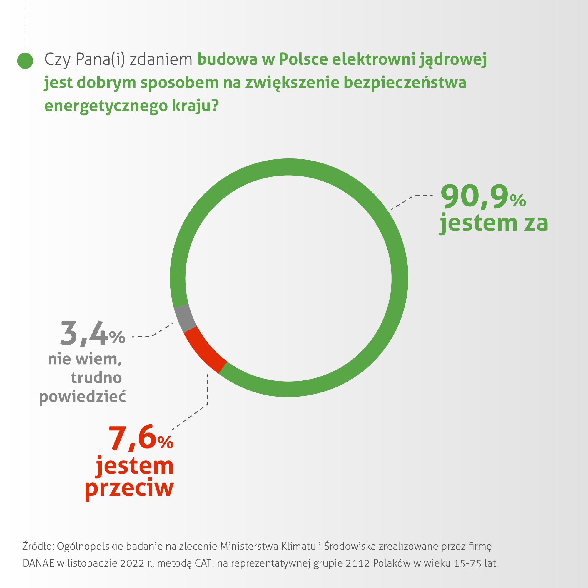 Blisko 90% ankietowanych uważa, że budowa elektrowni jądrowej jest dobrym sposobem na walkę ze zmianami klimatycznymi. Z kolei ponad 90% biorących udział w badaniu jest zdania, że budowa w Polsce elektrowni jądrowej przyczyni się do zwiększenia bezpieczeństwa energetycznego kraju. Jednocześnie ponad 90% badanych potwierdziło, że słyszało o planach budowy pierwszej elektrowni jądrowej w Polsce.