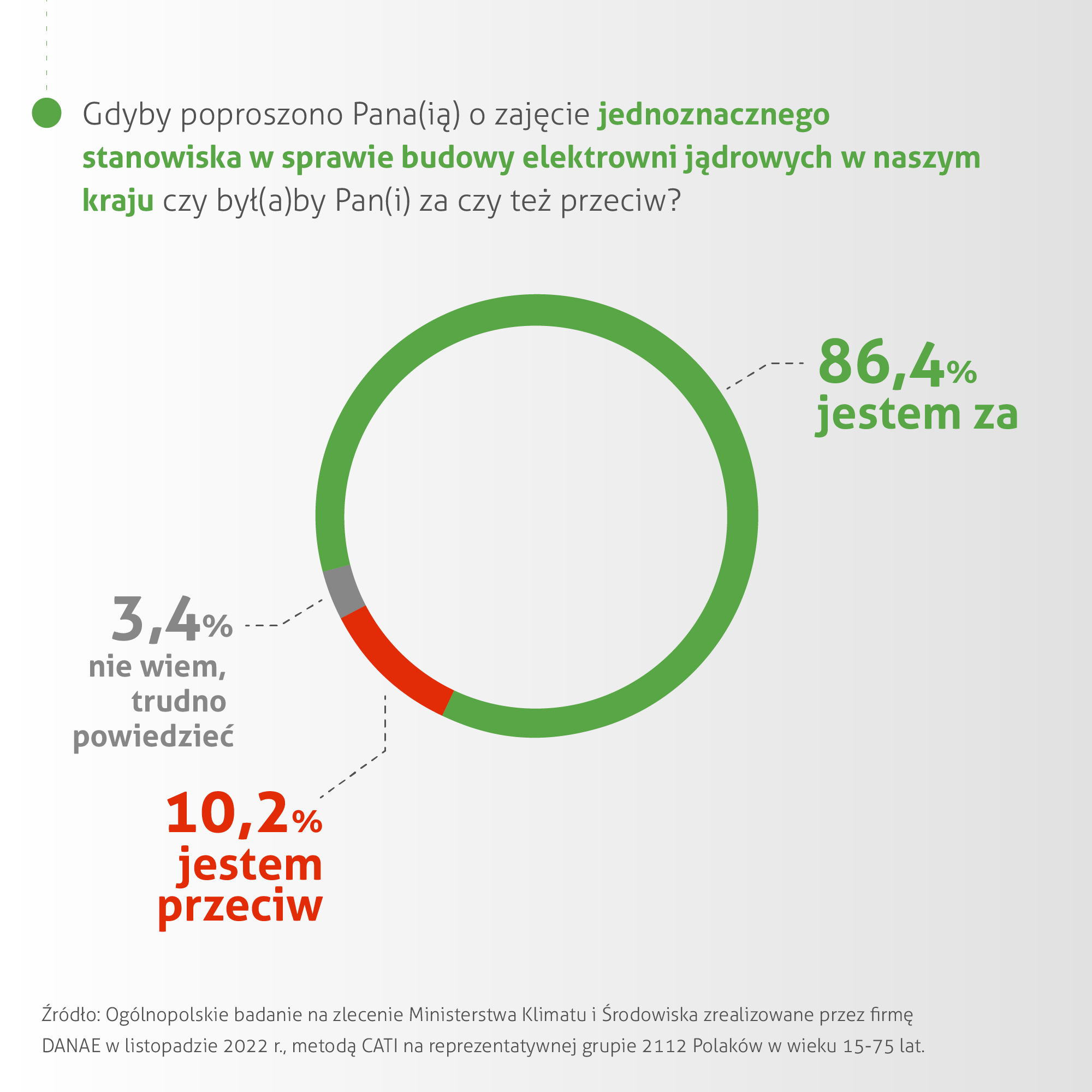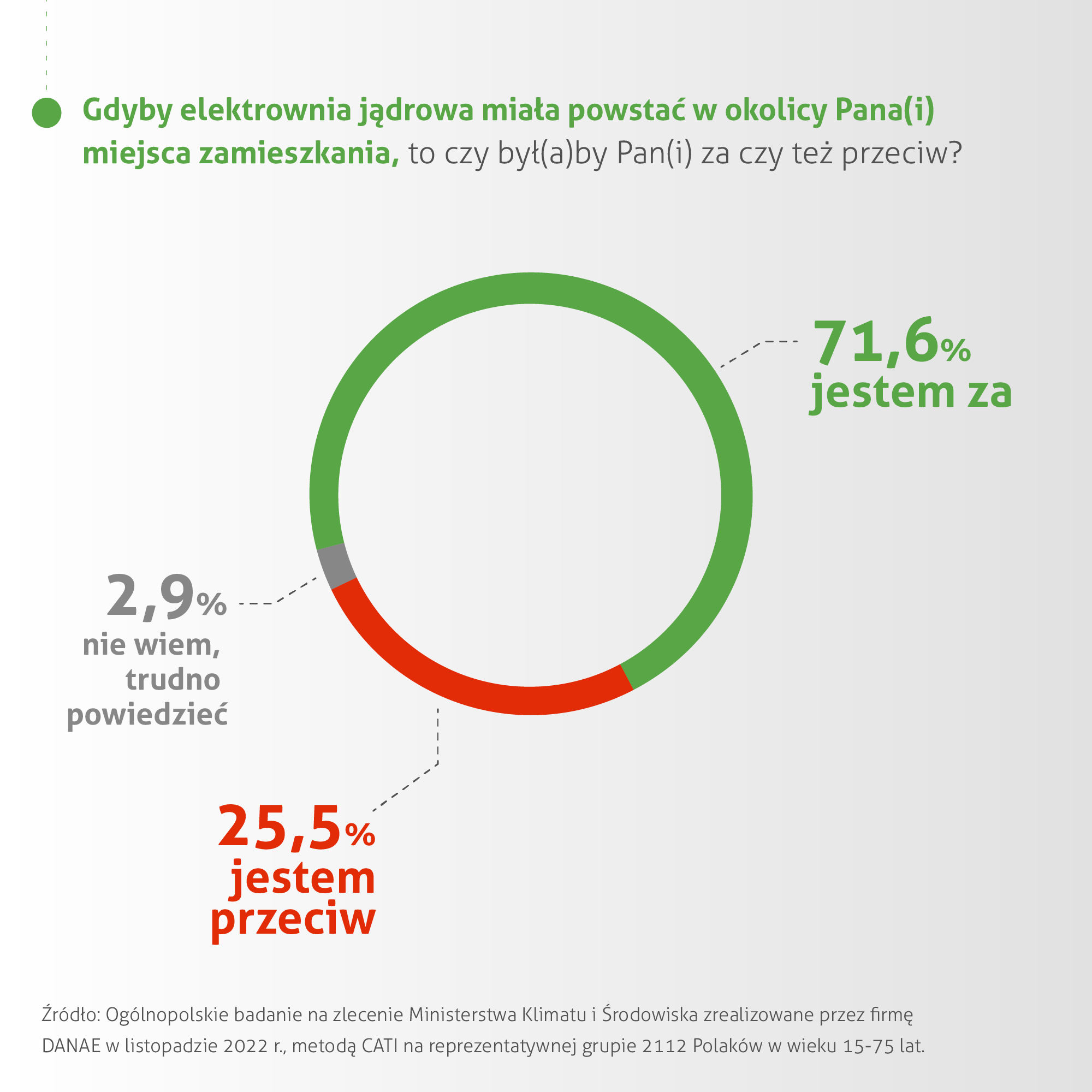 Badanie z listopada 2022 r. wskazuje, że ponad 86% ankietowanych wyraża poparcie dla elektrowni jądrowych w naszym kraju, a 10% jest przeciwnego zdania. W porównaniu do roku 2021 odnotowano wzrost zwolenników tego typu inwestycji aż o 12%.