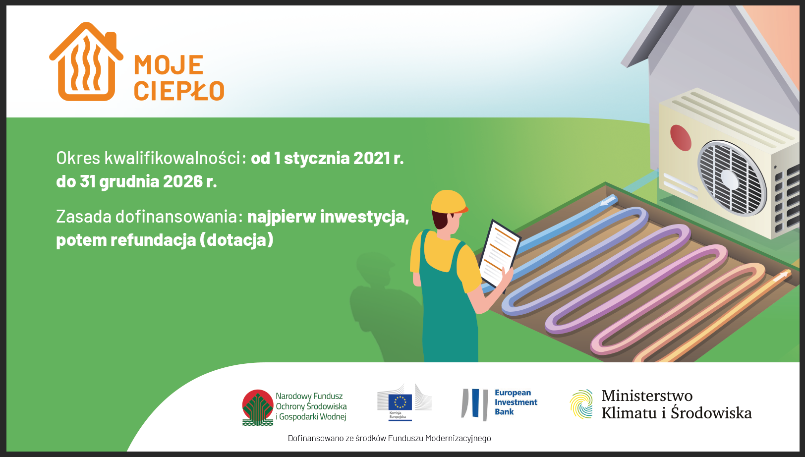 Narodowy Fundusz Ochrony Środowiska i Gospodarki Wodnej uruchomił nabór wniosków w programie „Moje Ciepło” 29 kwietnia 2022 r. Okres kwalifikowalności będzie natomiast liczony od 1 stycznia 2021 r. do 31 grudnia 2026 r. Osoby planujące zakup i montaż w swoim nowym domu jednorodzinnym pompy ciepła przy wsparciu finansowym z NFOŚiGW powinny pamiętać o bardzo istotnej zasadzie: najpierw inwestycja, potem refundacja w postaci bezzwrotnej dotacji. Jest to rozwiązanie stosowane także w innych programach powszechnych prowadzonych przez NFOŚiGW.