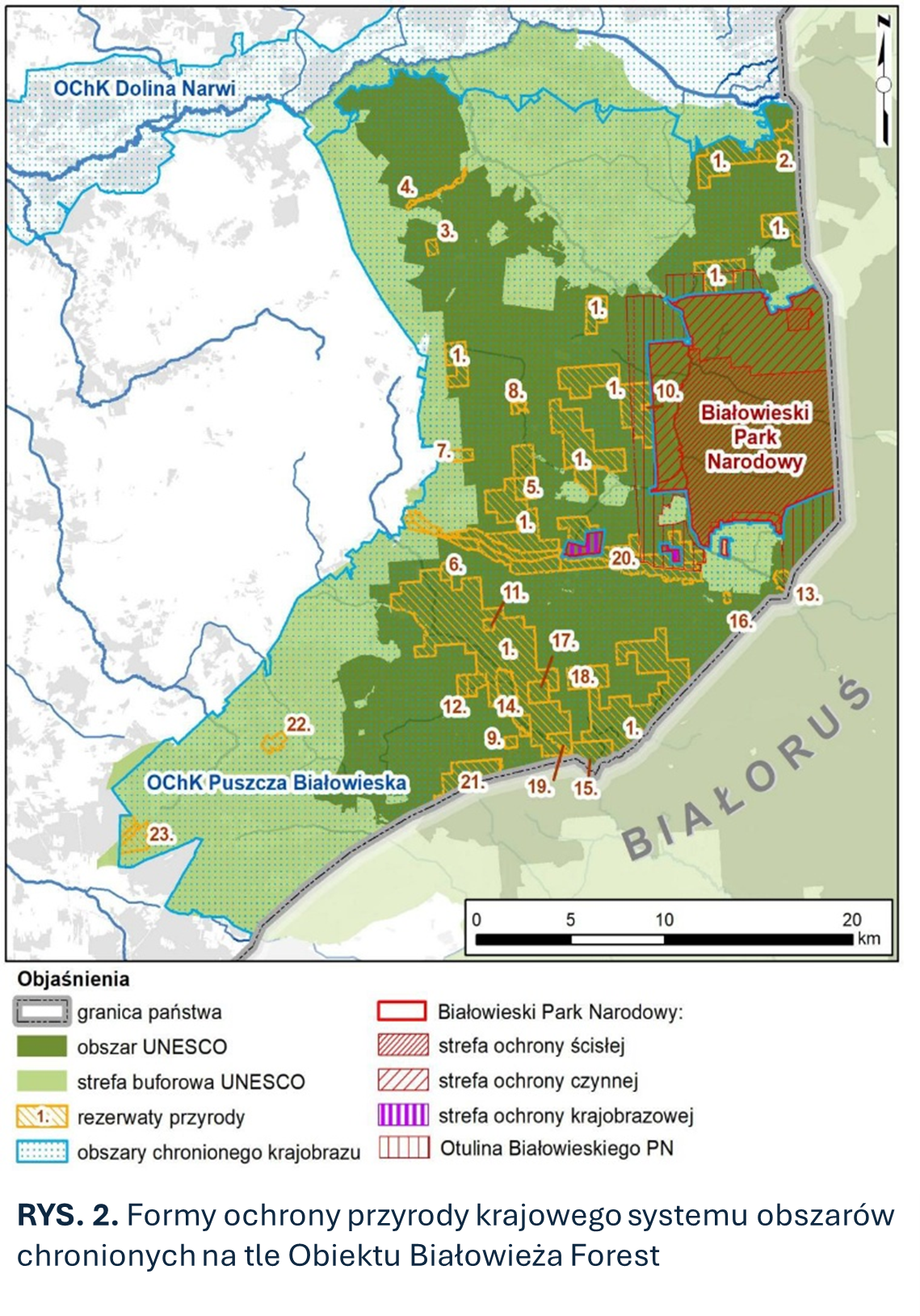 Białowieski Park Narodowy (BPN) zarządza środkową częścią Obiektu o powierzchni 10 517,27 ha, co stanowi 17,6% polskiej części powierzchni Obiektu (Rys. 2). Wokół Parku ustanowiono otulinę o powierzchni 3 224,26 ha. Cele ochronne tych terenów reguluje Plan ochrony Białowieskiego Parku Narodowego na lata 2015-2034. Obejmuje on trzy strefy ochronne: ochronę ścisłą (57,6%), ochronę czynną (39%) oraz ochronę krajobrazową (3,4%).