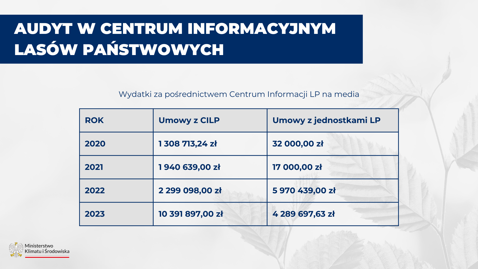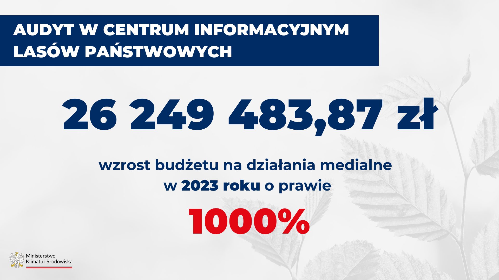 Audyt wykazał również skalę zwiększania przez byłe kierownictwo Lasów Państwowych budżetu Centrum Informacyjnego Lasów Państwowych przeznaczonego na działania medialne, który w roku 2023 wzrósł o blisko 1000% w stosunku do roku 2020, osiągając poziom ponad 14,6 mln złotych. Tylko do podmiotów gospodarczych związanych z tygodnikiem „Do Rzeczy” w latach 2020-2023 trafiło niemal 2,5 mln zł.