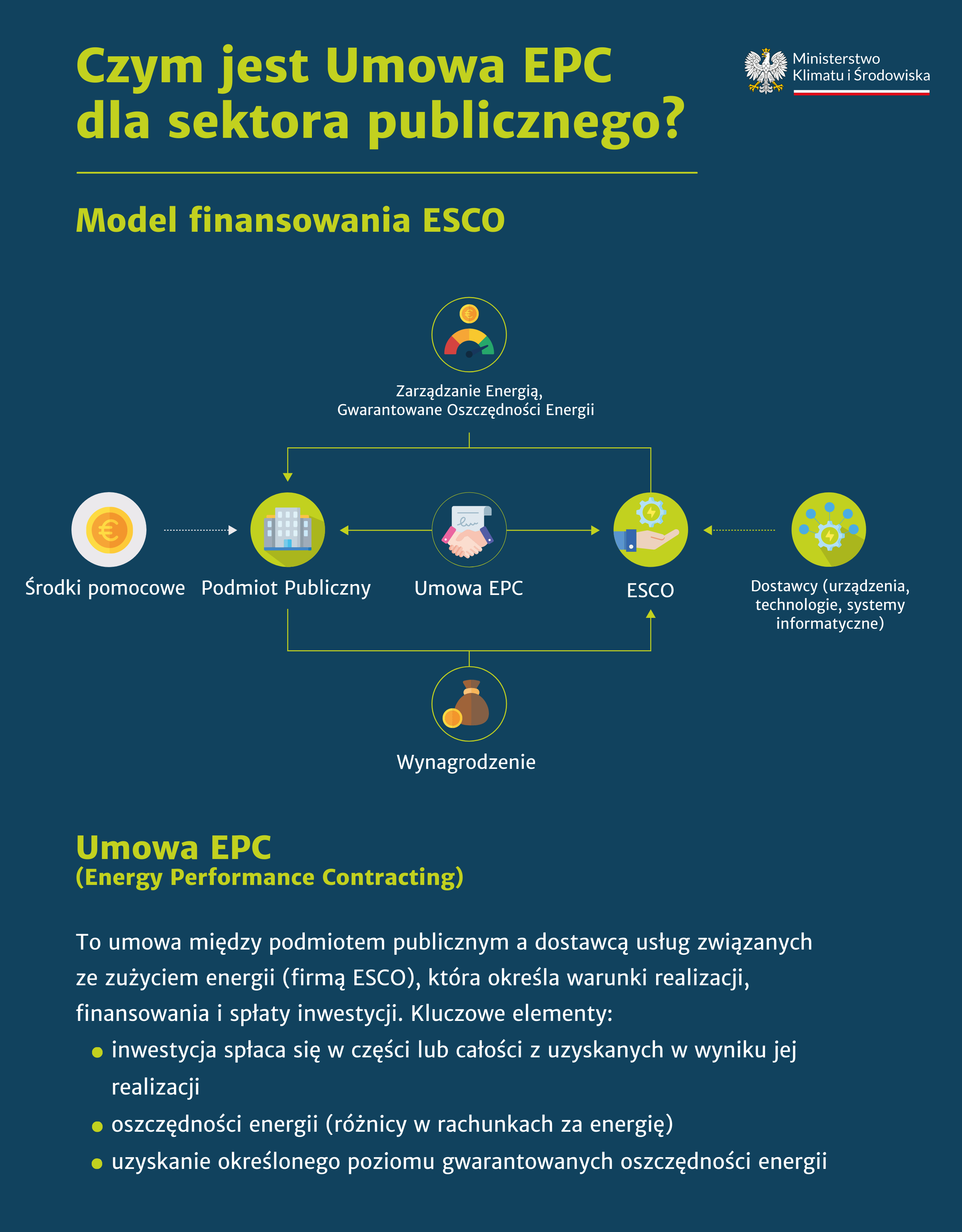 W celu ułatwienia realizacji przedsięwzięć w modelu finansowania ESCO, Ministerstwo Klimatu i Środowiska przygotowało praktyczne i kompleksowe narzędzie – Wytyczne do umów o poprawę efektywności energetycznej EPC. Opracowany dokument jest przeznaczony dla jednostek sektora publicznego, a jego kluczowym elementem są wzorce umów EPC dla trzech rodzajów przedsięwzięć służących poprawie efektywności energetycznej.