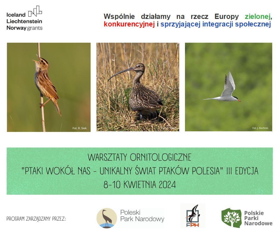 Celem kolejnej już edycji warsztatów ornitologicznych "Ptaki wokół nas - unikalny świat ptaków Polesia" jest przekazanie wiedzy o znaczeniu bogactwie i różnorodności biologicznej obszaru Polesia ora form jego ochrony. Szkolenie rozpocznie się 8 kwietnia i potrwa do 10 kwietnia 2024 r. Szczegóły wydarzenia oraz formularz zgłoszeniowy dostępne są na stronie Parku (link).