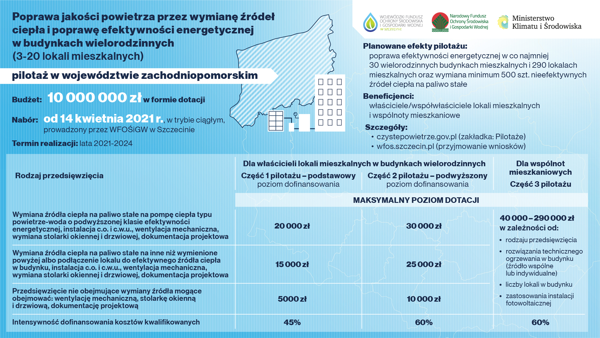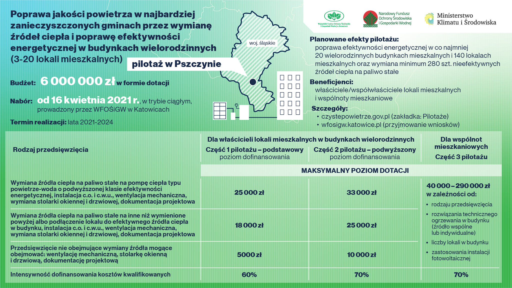 Od 16 sierpnia 2021 r. obowiązują ułatwienia w dwóch pilotażach Narodowego Funduszu Ochrony Środowiska i Gospodarki Wodnej służących poprawie jakości powietrza. Zmiany mają zachęcić mieszkańców budynków wielorodzinnych w woj. zachodniopomorskim i w Pszczynie (woj. śląskie) do wymiany tzw. kopciuchów i termomodernizacji domów.