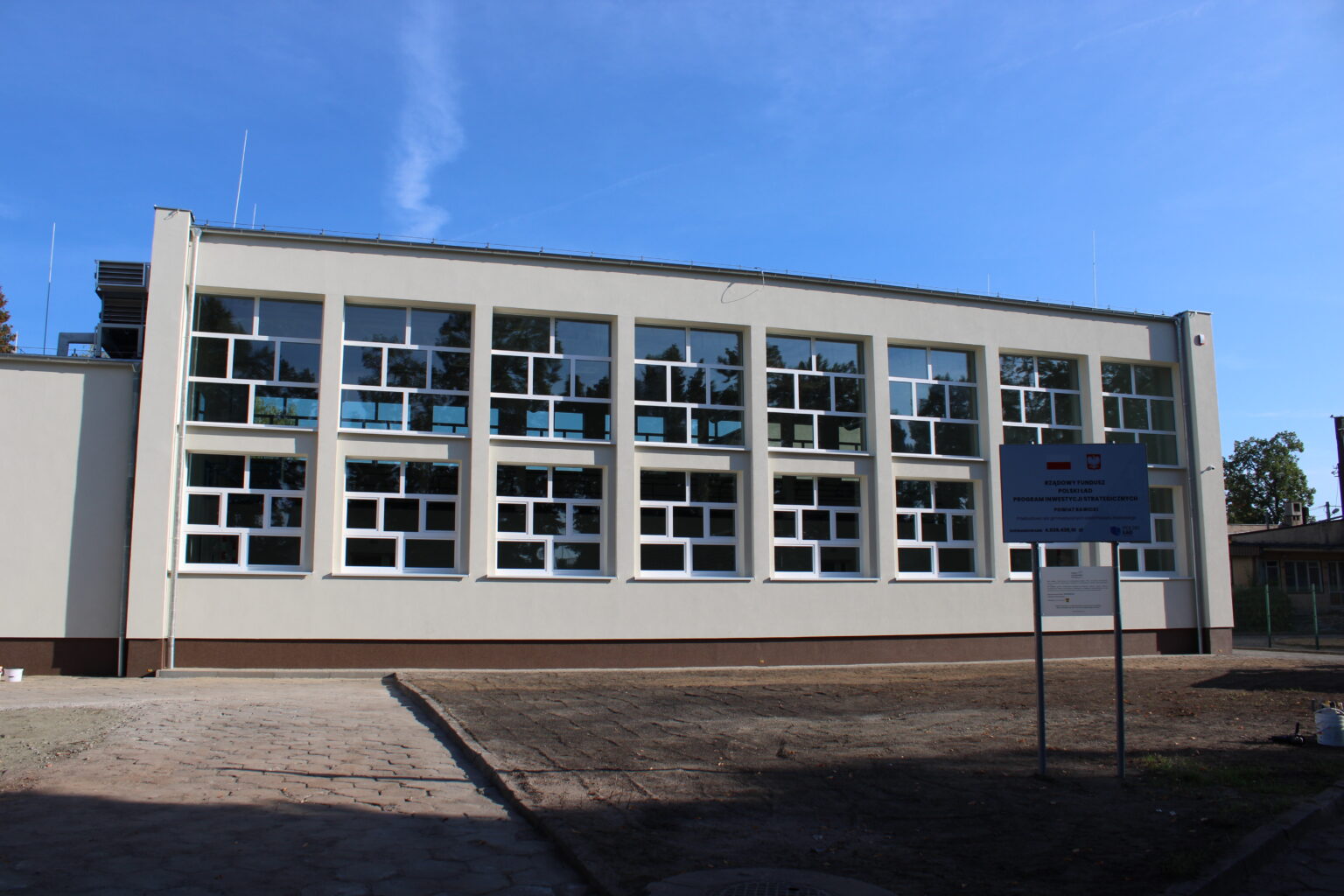Na zdjęciu budynek sali gimnastycznej ZSZ w Rawiczu - projekt Powiatu Rawickiego pn. Modernizacja sali gimnastycznej ZS Przyrodniczo-Technicznych CKU w Bojanowie i sali gimnastycznej ZSZ w Rawiczu wdrażany w Programie klimatycznym EOG