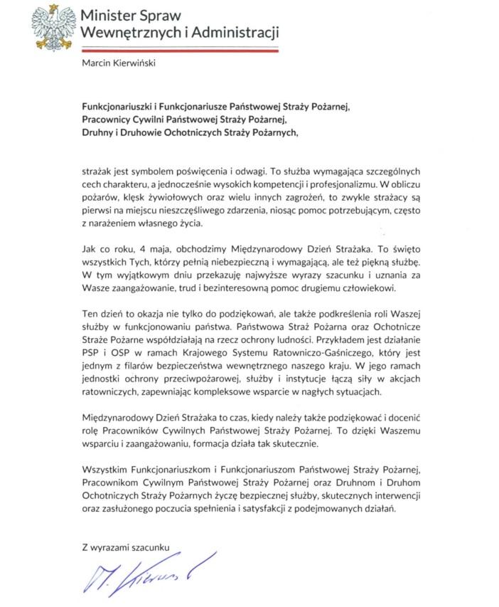 W Dniu Strażaka przywołujemy nazwiska tych, którzy tworzą poczet historycznych architektów systemu ochrony przeciwpożarowej, a także postaci, o których pamięć niezmiennie buduje siłę straży pożarnych na elementarnych, lokalnych szczeblach. Przypominamy dorobek całych strażackich pokoleń będący fundamentem wartości, na których wspiera się nasza pożarnicza tradycja. Jesteśmy przekonani, że będzie ona trwale podtrzymywana, uroczyście w tym dniu witając w naszych szeregach nowe twarze, a szczególnie gorąco pożarniczą młodzież. To Wasze życiowe wybory i postawy – silniej, niż jakiekolwiek rozwiązania prawne i organizacyjne – ostatecznie zaważą na kondycji i wizerunku polskiego ratownictwa oraz naszym miejscu w Europie i na świecie.