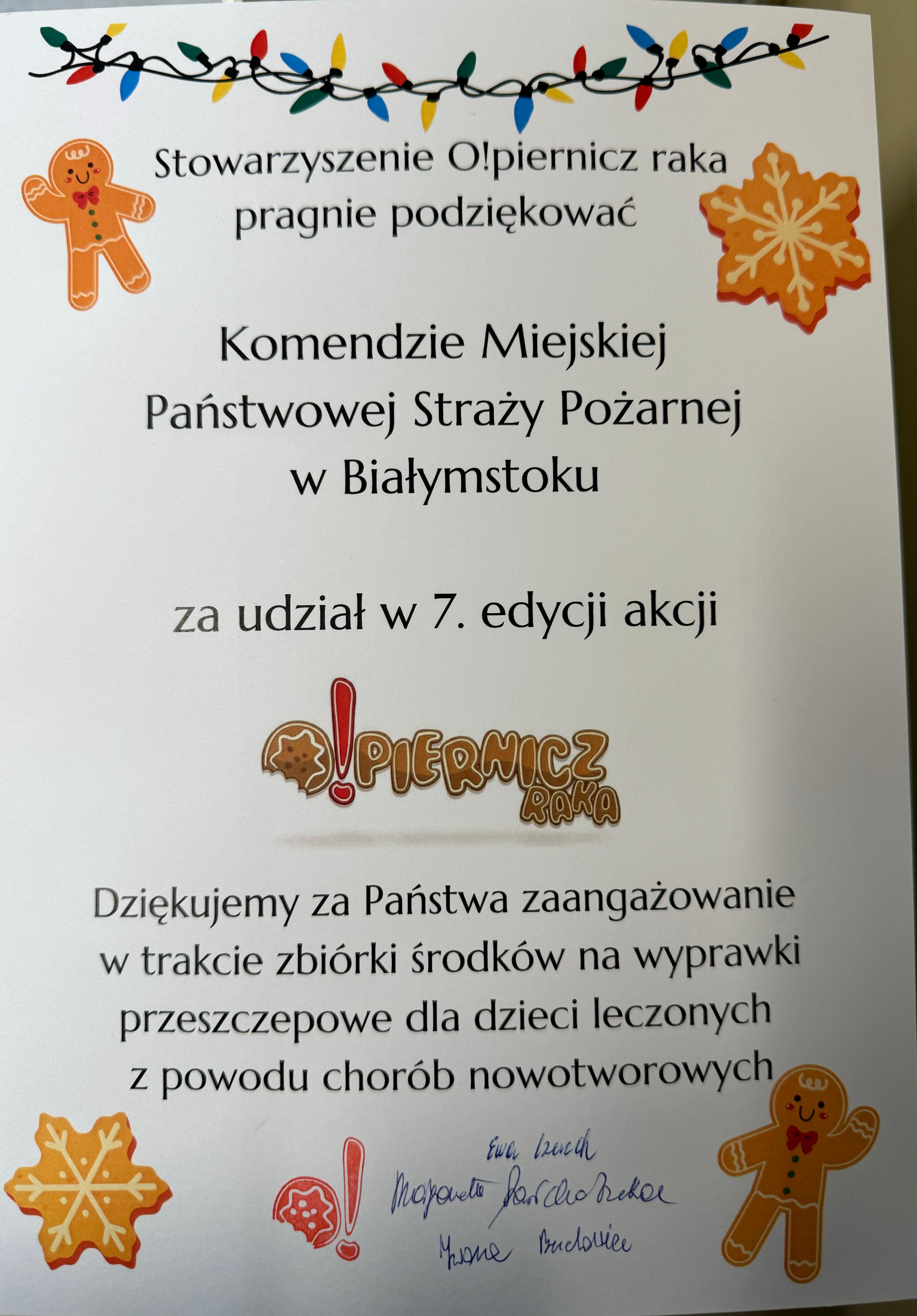 Na przełomie roku 2024/2025 w Komendzie Miejskiej Państwowej Straży Pożarnej w Białymstoku odbyła się zbiórka środków finansowych na ten cel. Cały dochód z tej akcji, a udało nam się zebrać kwotę w wysokości 6900 zł, zostanie przekazany na zakup wyprawek pacjentom, którzy oczekują na przeszczep szpiku.